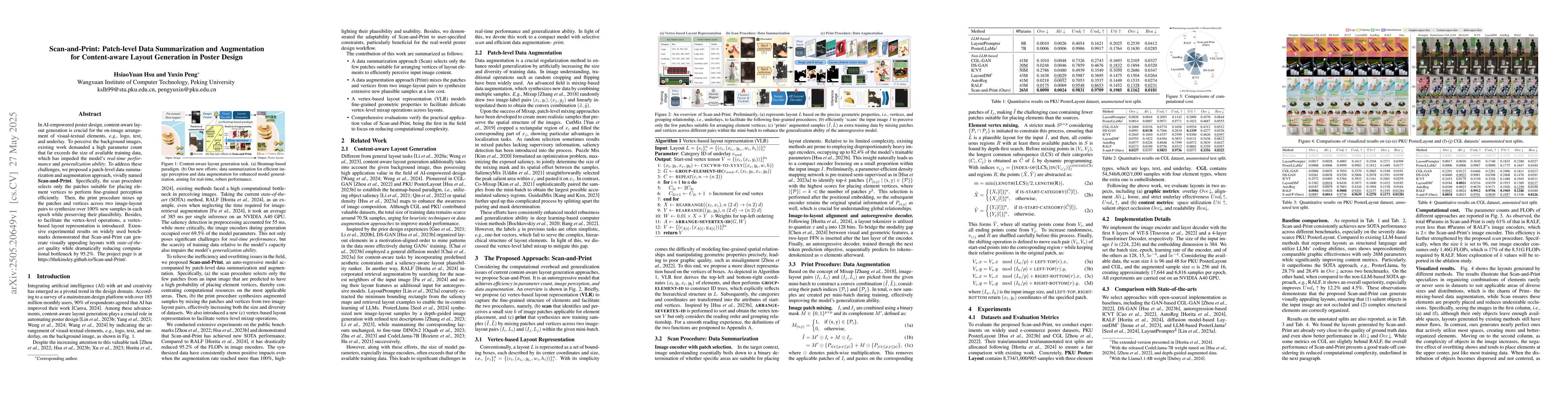 This paper proposes Scan-and-Print, a method that efficiently generates visually appealing poster layouts while reducing computational complexity, by summarizing and augmenting background images at patch level.
