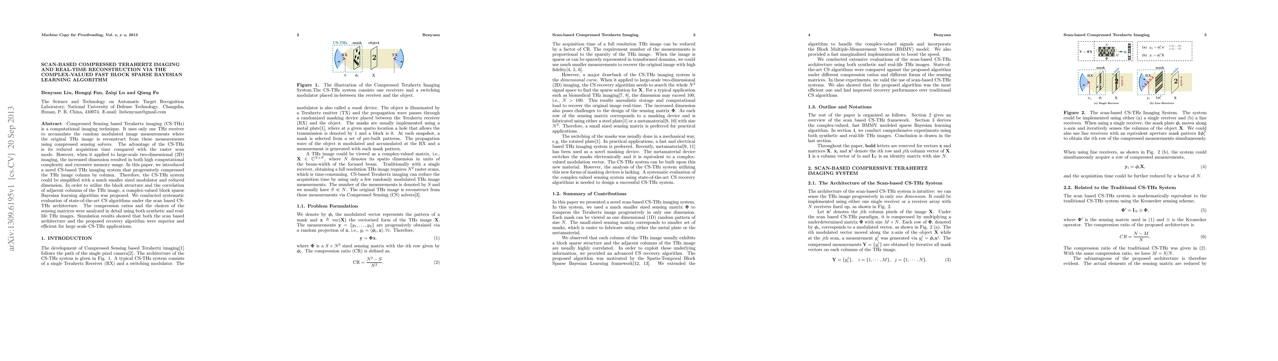 This paper introduces a novel compressed sensing-based terahertz imaging system that employs a scan-based architecture and a complex-valued fast block sparse Bayesian learning algorithm for efficient real-time reconstruction, significantly reducing computational complexity and memory usage. The proposed method demonstrates superior performance in large-scale applications compared to existing compressed sensing algorithms.