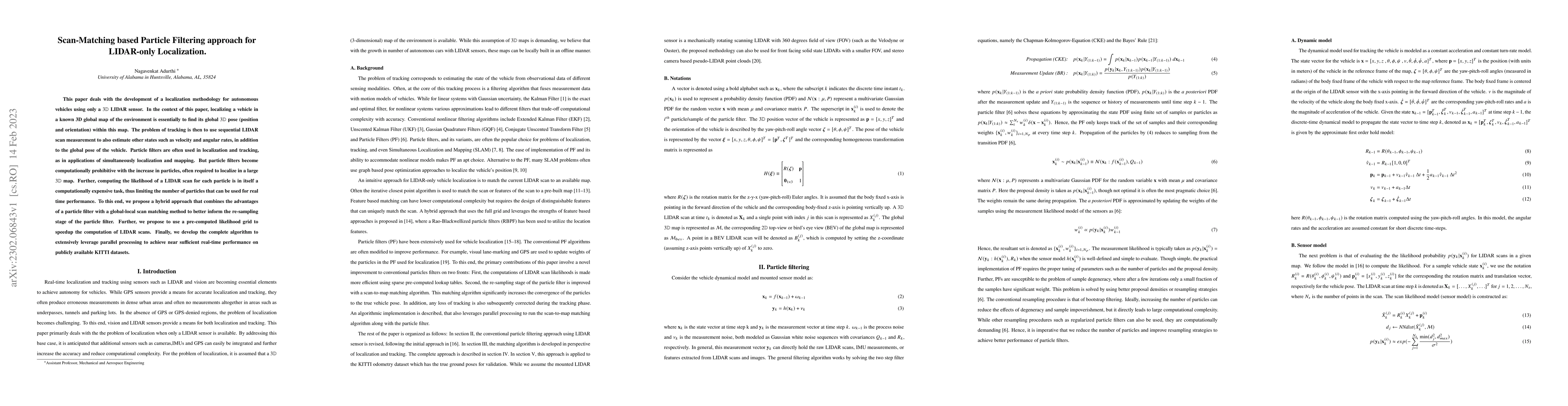 This paper proposes a scan-matching based particle filtering approach for LIDAR-only localization of autonomous vehicles, combining particle filters with global-local scan matching to enhance re-sampling efficiency and using a pre-computed likelihood grid for faster computation, all optimized for parallel processing to achieve real-time performance.