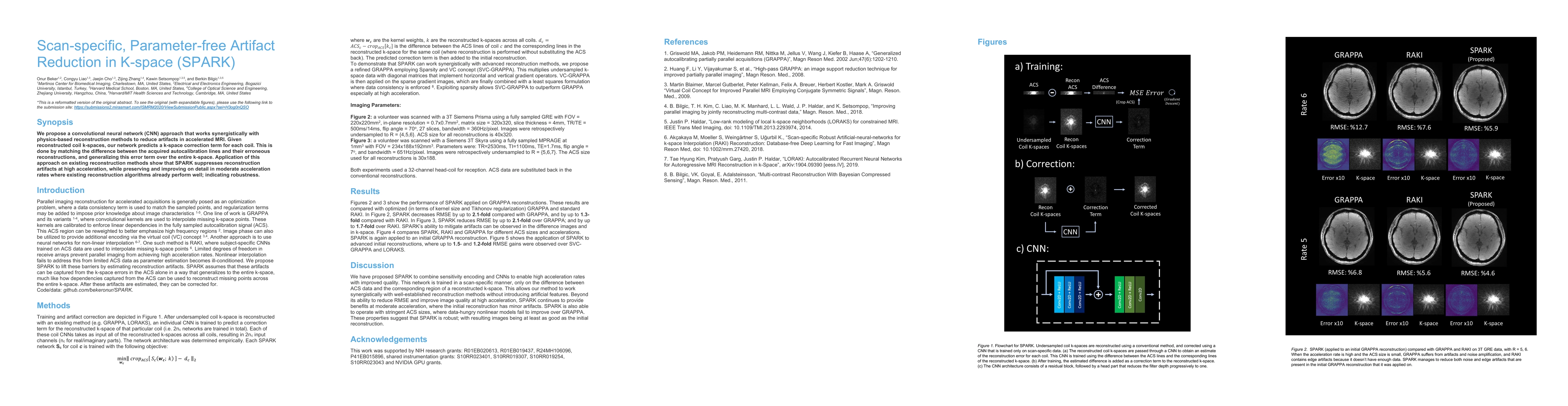 Title: Scan-specific, Parameter-free Artifact Reduction in K-space (SPARK) Summary: This paper introduces SPARK, a convolutional neural network that enhances MRI reconstruction by predicting k-space correction terms, reducing artifacts without requiring scan-specific parameters, and improving detail preservation across various acceleration rates.
