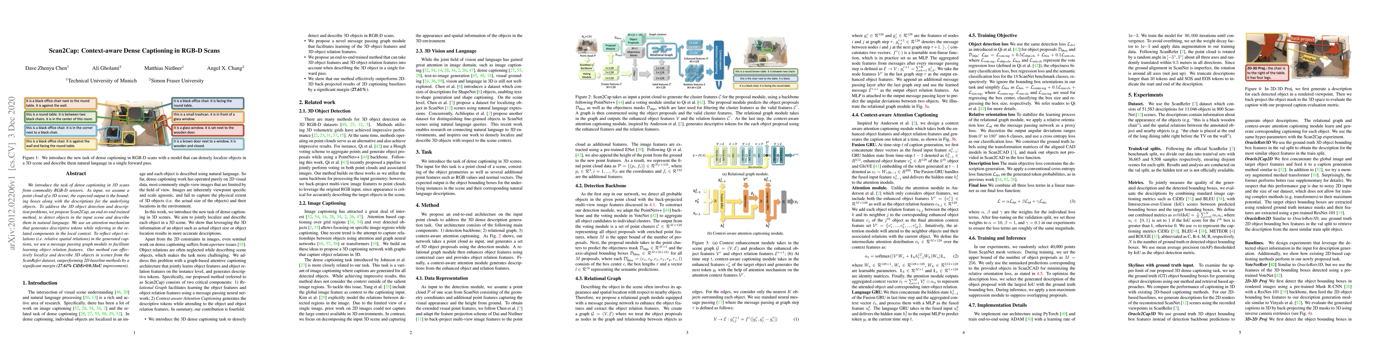 Scan2Cap is an end-to-end method for dense captioning in 3D RGB-D scans, utilizing an attention mechanism and a message passing graph module to describe objects contextually and spatially. It outperforms 2D baselines by 27.61% in [email protected] on the ScanRefer dataset.
