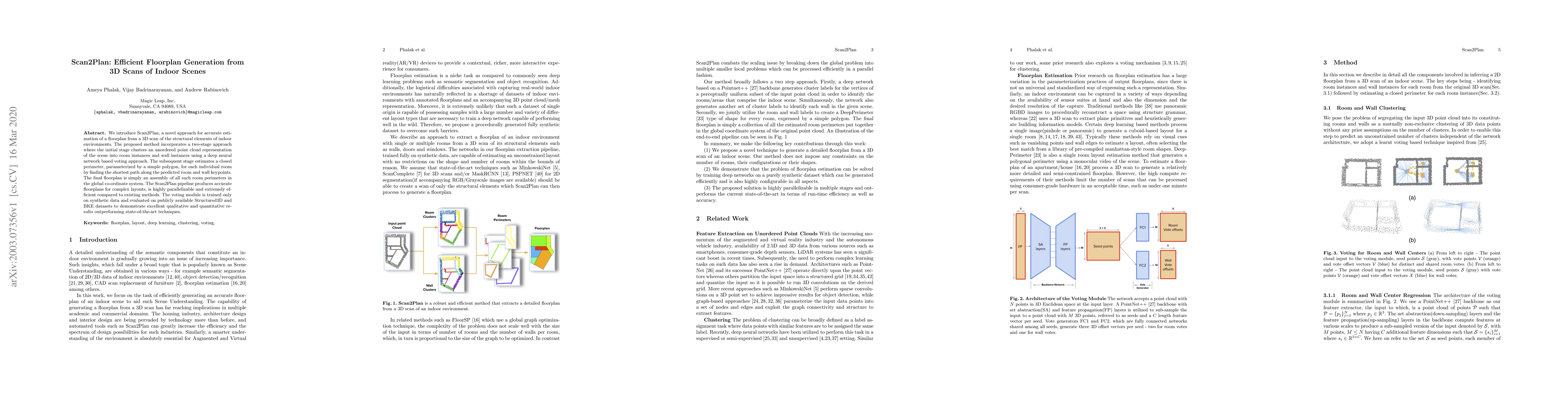 Scan2Plan is a two-stage method for generating accurate floorplans from 3D scans of indoor environments, utilizing deep neural networks for clustering and perimeter estimation. It outperforms existing techniques by producing efficient and precise floorplans for complex layouts.