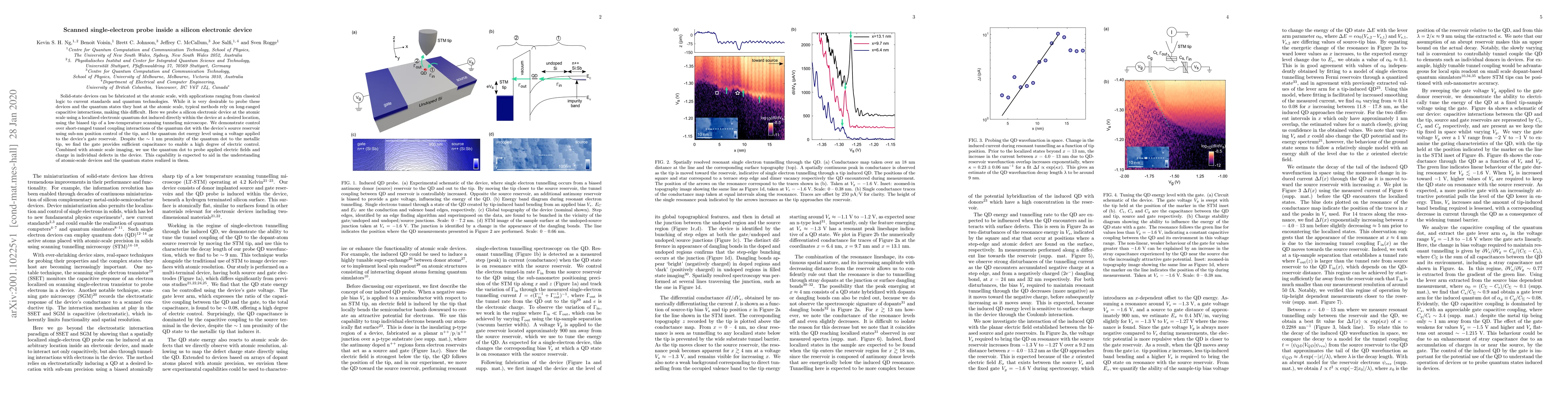 This paper demonstrates atomic-scale probing of a silicon electronic device using a localized electronic quantum dot induced by a scanning tunneling microscope tip, achieving precise control over quantum dot interactions and energy levels to investigate electric fields and charge in individual defects. This method provides insights into atomic-scale devices and their quantum states.