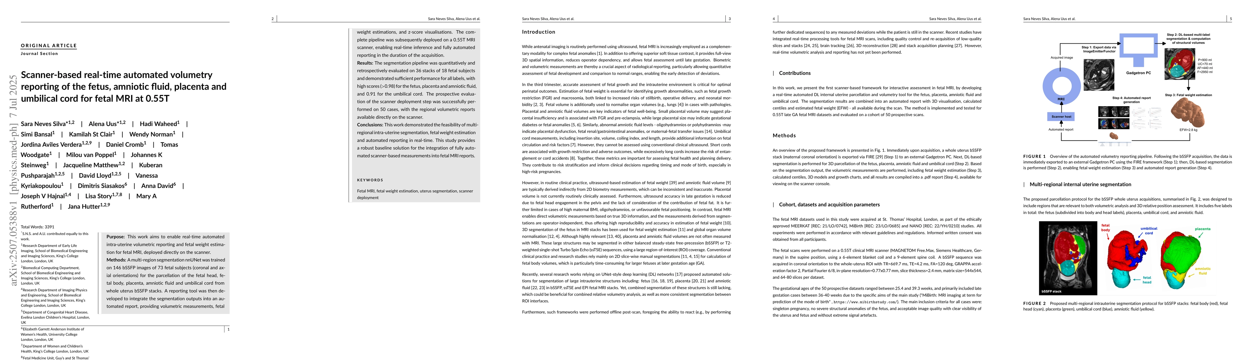 This study developed a multi-region segmentation nnUNet trained on 146 bSSFP images from 73 fetal subjects for parcellation of fetal head, body, placenta, amniotic fluid, and umbilical cord from whole uterus bSSFP stacks. A reporting tool was then integrated to provide volumetric measurements, fetal weight estimations, and z-score visualizations, deployed on a 0.55T MRI scanner for real-time inference and automated reporting.