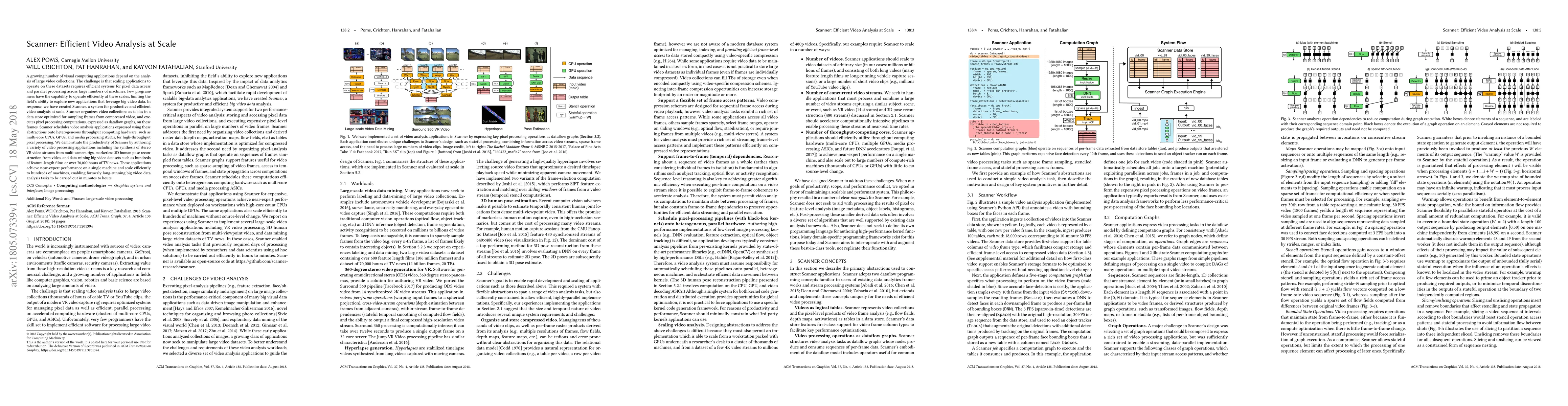 The research introduces Scanner, a system designed for efficient video analysis at scale. It organizes video data as samples in a specialized data store and uses dataflow graphs for pixel processing, executed in parallel across various computing hardware. Scanner enables the creation of complex video applications, like generating stereo VR from multi-camera rigs or reconstructing 3D human poses from video, achieving near-expert performance on single machines and scaling efficiently to hundreds of machines.