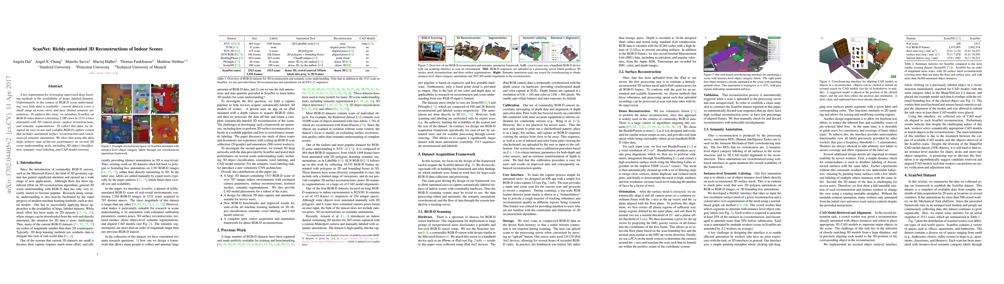 ScanNet presents a large RGB-D video dataset with 2.5M views across 1513 indoor scenes, enriched with 3D camera poses, surface reconstructions, and semantic segmentations, significantly advancing 3D scene understanding tasks. The dataset's availability fosters state-of-the-art performance in 3D object classification, semantic voxel labeling, and CAD model retrieval.