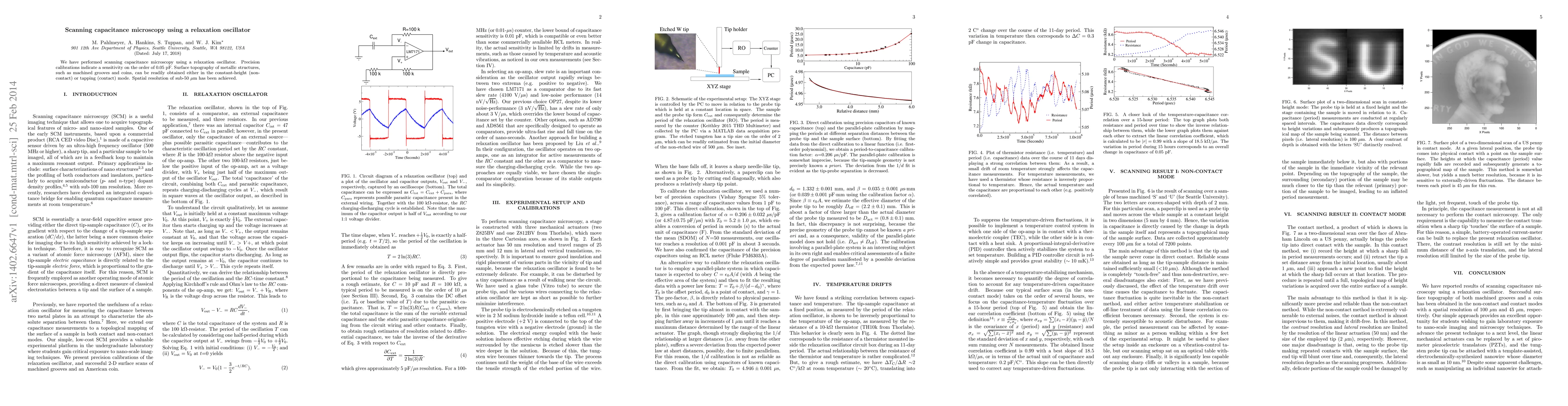 This paper details the use of a relaxation oscillator in scanning capacitance microscopy, achieving a sensitivity of 0.05 pF and sub-50 µm spatial resolution. The method allows for surface topography analysis of metallic structures in both constant-height and tapping modes.