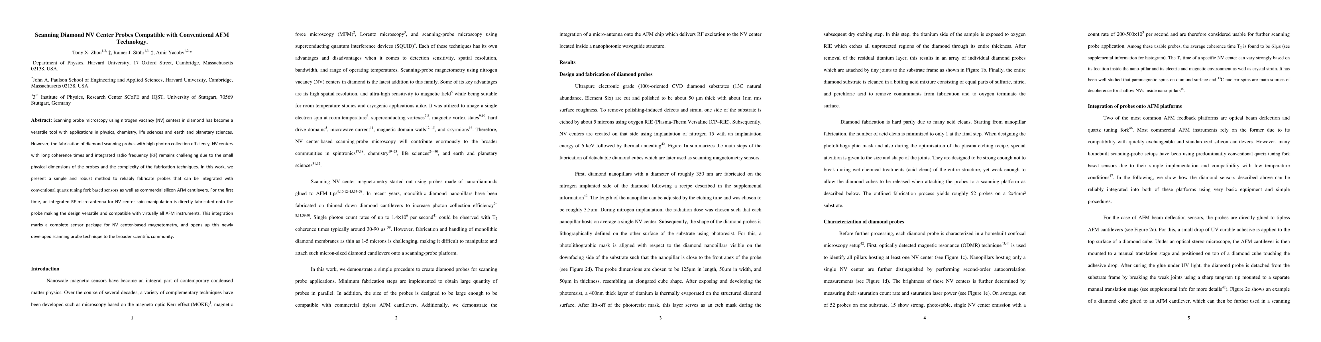 This paper presents a novel method for fabricating diamond scanning probes with NV centers, integrating them with conventional AFM sensors and including an RF micro-antenna for spin manipulation. This approach makes the technique accessible to a wider range of AFM instruments, enhancing its applicability across various scientific fields.