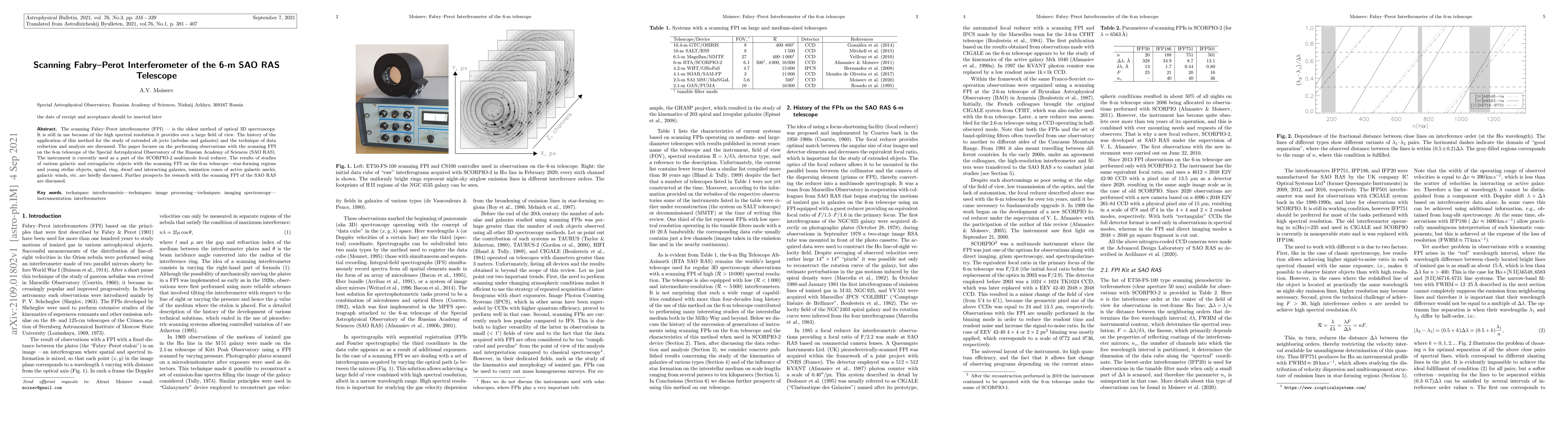 The scanning Fabry-Perot interferometer (FPI) - is the oldest method of optical 3D spectroscopy. It is still in use because of the high spectral resolution it provides over a large field of view. The history of the application of this method for the study of extended ob jects (nebulae and galaxies) and the technique of data reduction and analysis are discussed. The paper focuses on the performing observations with the scanning FPI on the 6-m telescope of the Special Astrophysical Observatory of the Russian Academy of Sciences (SAO RAS). The instrument is currently used as a part of the SCORPIO-2 multimode focal reducer. The results of studies of various galactic and extragalactic objects with the scanning FPI on the 6-m telescope - star-forming regions and young stellar objects, spiral, ring, dwarf and interacting galaxies, ionization cones of active galactic nuclei, galactic winds, etc. are briefly discussed. Further prospects for research with the scanning FPI of the SAO RAS are discussed.
