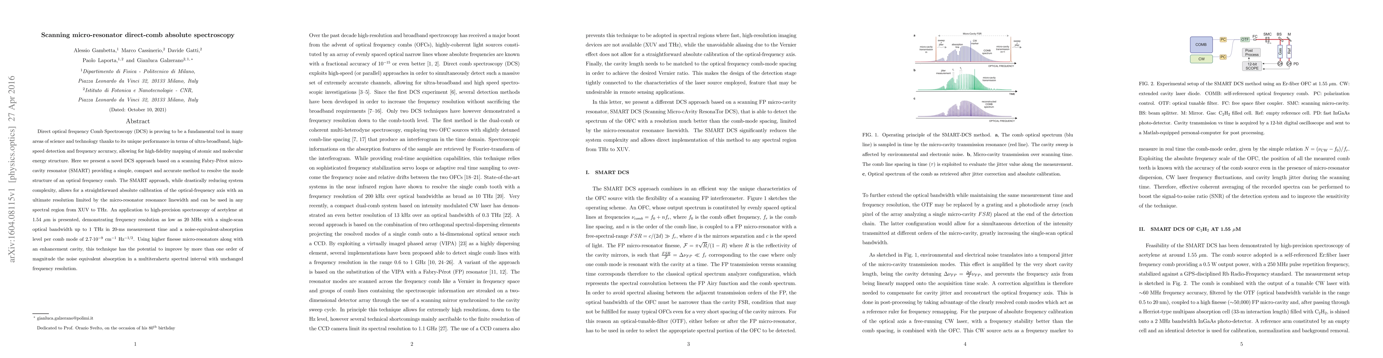 Direct optical frequency Comb Spectroscopy (DCS) is proving to be a fundamental tool in many areas of science and technology thanks to its unique performance in terms of ultra-broadband, high-speed detection and frequency accuracy, allowing for high-fidelity mapping of atomic and molecular energy structure. Here we present a novel DCS approach based on a scanning Fabry-Perot micro-cavity resonator (SMART) providing a simple, compact and accurate method to resolve the mode structure of an optical frequency comb. The SMART approach, while drastically reducing system complexity, allows for a straightforward absolute calibration of the optical-frequency axis with an ultimate resolution limited by the micro-resonator resonance linewidth and can be used in any spectral region from XUV to THz. An application to high-precision spectroscopy of acetylene at 1.54 um is presented, demonstrating frequency resolution as low as 20 MHz with a single-scan optical bandwidth up to 1 THz in 20-ms measurement time and a noise-equivalent-absorption level per comb mode of 2.7 10^-9 cm^-1 Hz^(-1/2). Using higher finesse micro-resonators along with an enhancement cavity, this technique has the potential to improve by more than one order of magnitude the noise equivalent absorption in a multiterahertz spectral interval with unchanged frequency resolution.