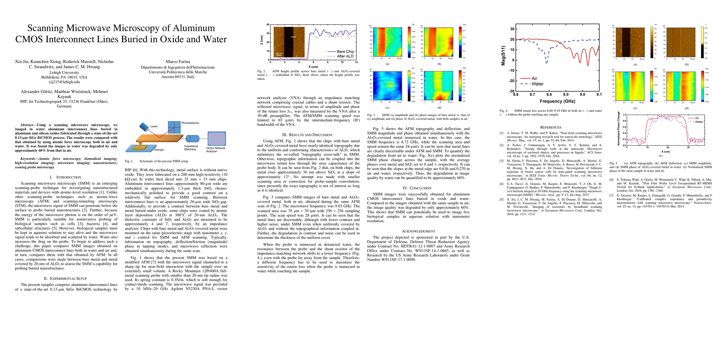 This study employs scanning microwave microscopy to image buried aluminum interconnect lines in oxide and water, comparing results with atomic force microscopy. The findings show that microwave imaging in water degrades by about 60% compared to air, indicating effective imaging capability even in aqueous environments.
