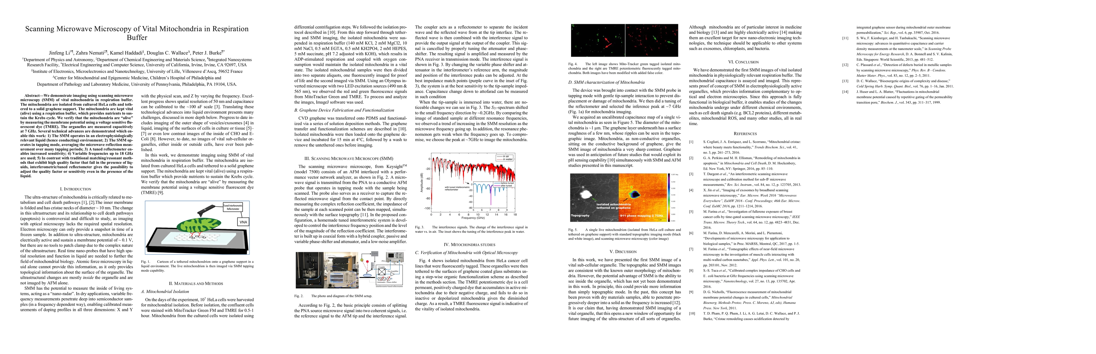 The research methodology involved isolating mitochondria from HeLa cells, tethering them to a solid graphene support, and maintaining their viability using a respiration buffer. The mitochondria's vitality was verified using a voltage-sensitive fluorescent dye (TMRE). Scanning microwave microscopy (SMM) was employed to measure the mitochondria capacitively at 7 GHz, with several technical advances enabling this work, including operating in a liquid environment, using tapping mode, employing a tuned reflectometer, and utilizing variable frequencies up to 18 GHz.