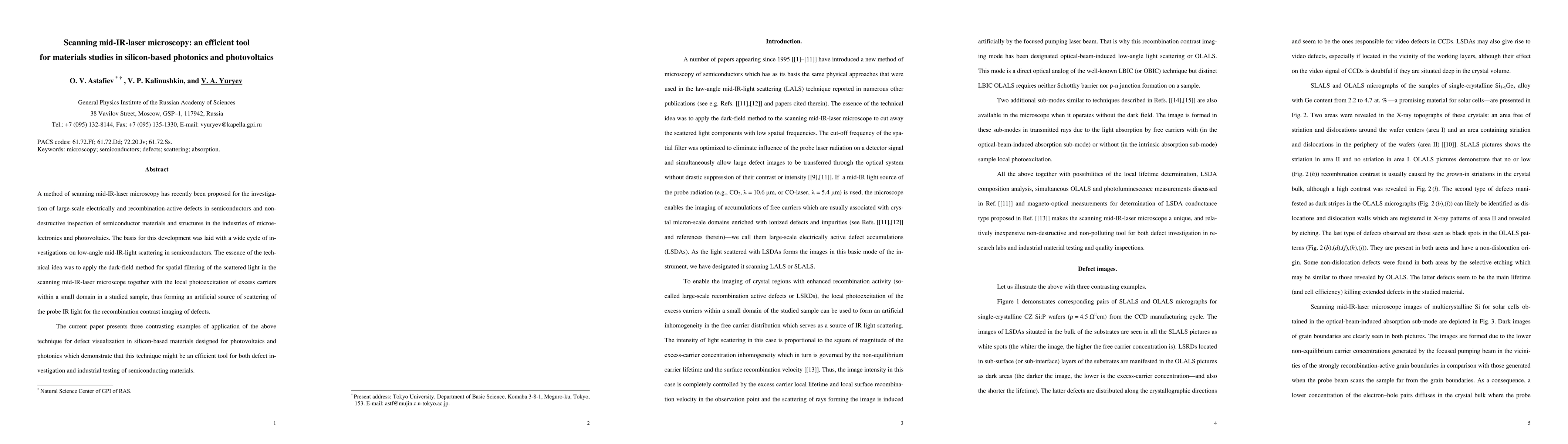 This paper proposes scanning mid-IR-laser microscopy as an effective method for identifying large-scale defects in silicon-based materials used in photonics and photovoltaics. The technique combines dark-field scattering and local photoexcitation to visualize defects, demonstrated through three practical applications in the semiconductor industry.