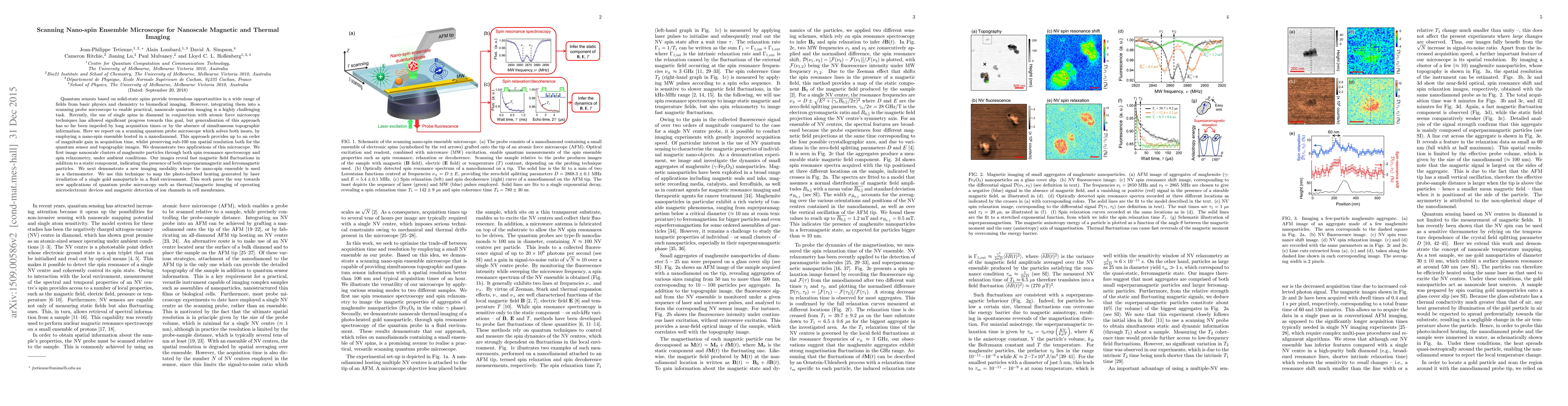 Quantum sensors based on solid-state spins provide tremendous opportunities in a wide range of fields from basic physics and chemistry to biomedical imaging. However, integrating them into a scanning probe microscope to enable practical, nanoscale quantum imaging is a highly challenging task. Recently, the use of single spins in diamond in conjunction with atomic force microscopy techniques has allowed significant progress towards this goal, but generalisation of this approach has so far been impeded by long acquisition times or by the absence of simultaneous topographic information. Here we report on a scanning quantum probe microscope which solves both issues, by employing a nano-spin ensemble hosted in a nanodiamond. This approach provides up to an order of magnitude gain in acquisition time, whilst preserving sub-100 nm spatial resolution both for the quantum sensor and topographic images. We demonstrate two applications of this microscope. We first image nanoscale clusters of maghemite particles through both spin resonance spectroscopy and spin relaxometry, under ambient conditions. Our images reveal fast magnetic field fluctuations in addition to a static component, indicating the presence of both superparamagnetic and ferromagnetic particles. We next demonstrate a new imaging modality where the nano-spin ensemble is used as a thermometer. We use this technique to map the photo-induced heating generated by laser irradiation of a single gold nanoparticle in a fluid environment. This work paves the way towards new applications of quantum probe microscopy such as thermal/magnetic imaging of operating microelectronic devices and magnetic detection of ion channels in cell membranes.