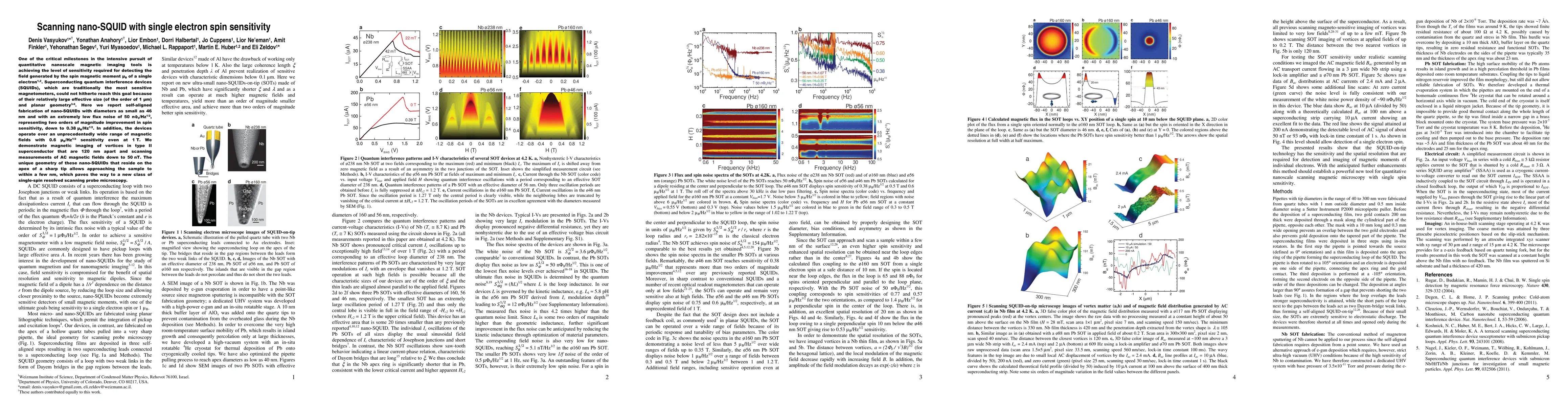 One of the critical milestones in the intensive pursuit of quantitative nanoscale magnetic imaging tools is achieving the level of sensitivity required for detecting the field generated by the spin magnetic moment {\mu}B of a single electron. Superconducting quantum interference devices (SQUIDs), which were traditionally the most sensitive magnetometers, could not hitherto reach this goal because of their relatively large effective size (of the order of 1 {\mu}m). Here we report self-aligned fabrication of nano-SQUIDs with diameters as small as 46 nm and with an extremely low flux noise of 50 n{\Phi}0/Hz^1/2, representing almost two orders of magnitude improvement in spin sensitivity, down to 0.38 {\mu}B/Hz^1/2. In addition, the devices operate over a wide range of magnetic fields with 0.6 {\mu}B/Hz^1/2 sensitivity even at 1 T. We demonstrate magnetic imaging of vortices in type II superconductor that are 120 nm apart and scanning measurements of AC magnetic fields down to 50 nT. The unique geometry of these nano-SQUIDs that reside on the apex of a sharp tip allows approaching the sample to within a few nm, which paves the way to a new class of single-spin resolved scanning probe microscopy.