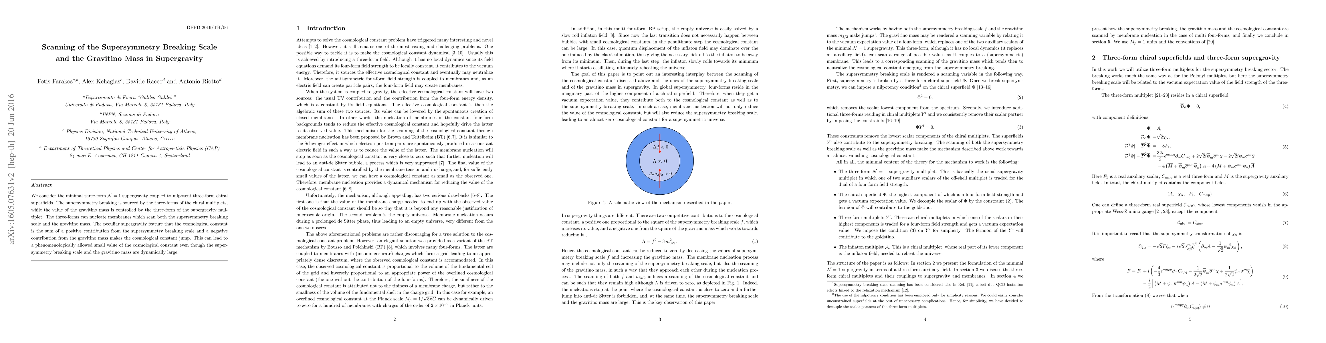 We consider the minimal three-form ${\cal N}=1$ supergravity coupled to nilpotent three-form chiral superfields. The supersymmetry breaking is sourced by the three-forms of the chiral multiplets, while the value of the gravitino mass is controlled by the three-form of the supergravity multiplet. The three-forms can nucleate membranes which scan both the supersymmetry breaking scale and the gravitino mass. The peculiar supergravity feature that the cosmological constant is the sum of a positive contribution from the supersymmetry breaking scale and a negative contribution from the gravitino mass makes the cosmological constant jump. This can lead to a phenomenologically allowed small value of the cosmological constant even though the supersymmetry breaking scale and the gravitino mass are dynamically large.