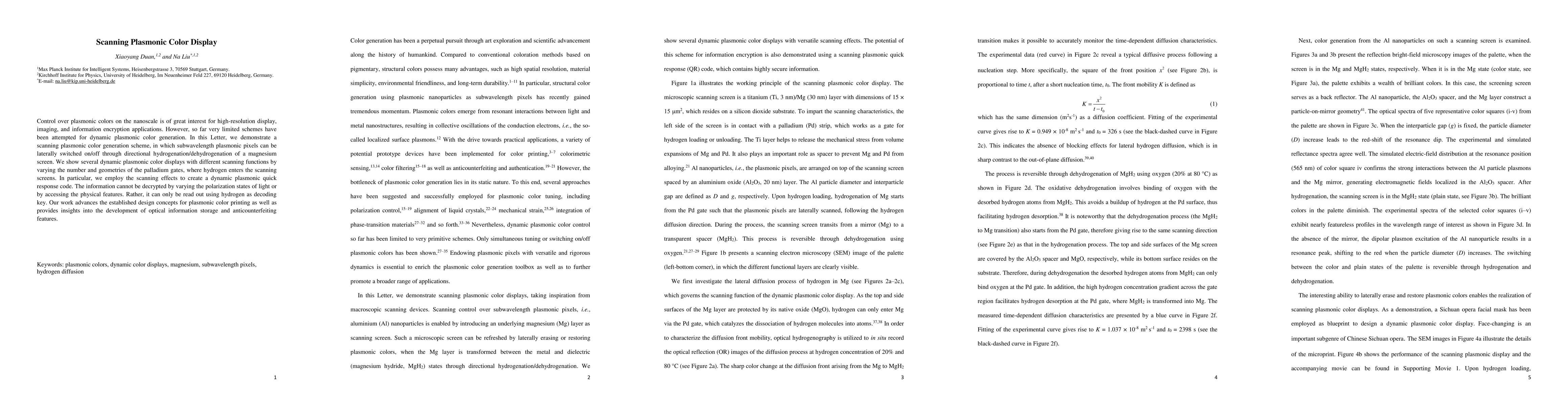 This paper presents a novel scanning plasmonic color display that dynamically switches subwavelength plasmonic pixels via hydrogenation/dehydrogenation of a magnesium screen, enabling high-resolution displays and information encryption. The method uses palladium gates to control hydrogen flow, demonstrating dynamic color displays and a secure QR code readable only with hydrogen.