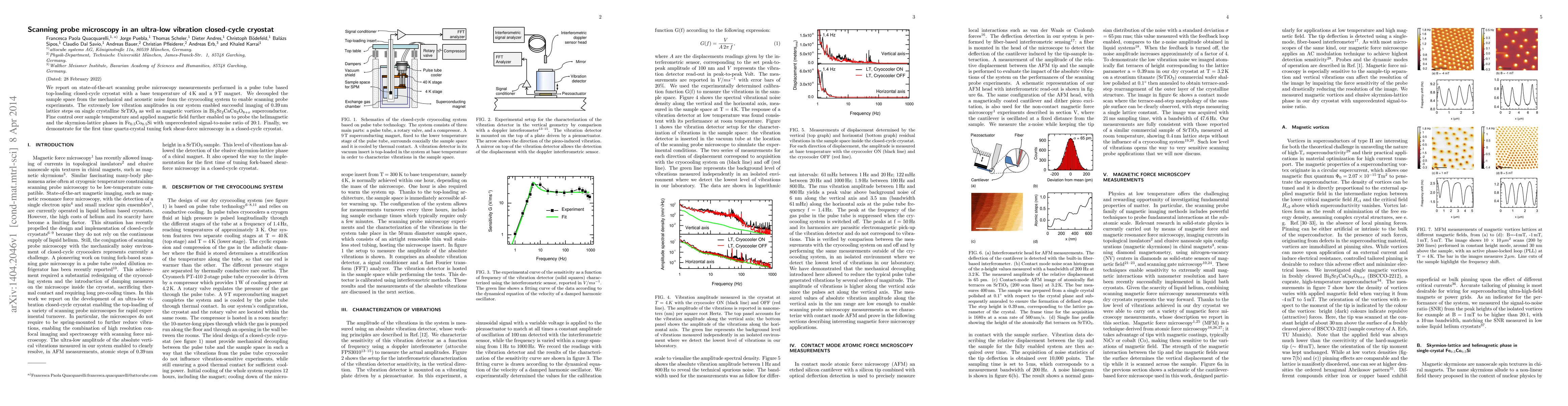 This paper details advanced scanning probe microscopy conducted in a low-vibration closed-cycle cryostat, achieving 0.39 nm resolution and enabling observation of magnetic vortices and helimagnetic phases with a 20:1 signal-to-noise ratio. The system also successfully implemented quartz-crystal tuning fork shear-force microscopy.