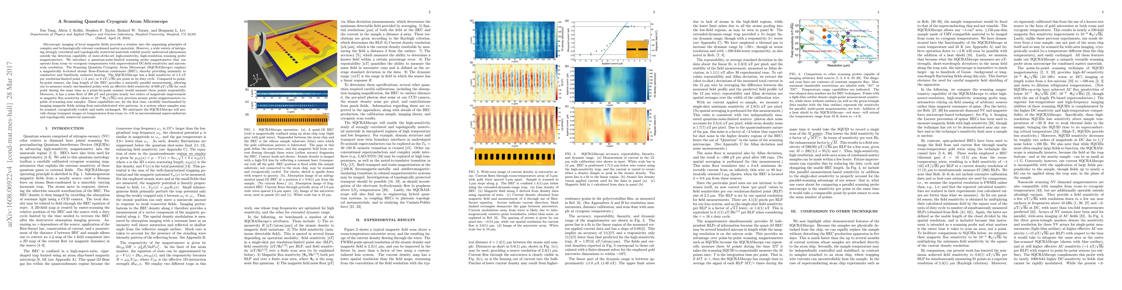 Microscopic imaging of local magnetic fields provides a window into the organizing principles of complex and technologically relevant condensed matter materials. However, a wide variety of intriguing strongly correlated and topologically nontrivial materials exhibit poorly understood phenomena outside the detection capability of state-of-the-art high-sensitivity, high-resolution scanning probe magnetometers. We introduce a quantum-noise-limited scanning probe magnetometer that can operate from room to cryogenic temperatures with unprecedented DC-field sensitivity and micron-scale resolution. The Scanning Quantum Cryogenic Atom Microscope (SQCRAMscope) employs a magnetically levitated atomic Bose-Einstein condensate (BEC), thereby providing immunity to conductive and blackbody radiative heating. It has a field sensitivity of 1.4 nT per resolution-limited point ($\sim$2 $\mu$m), or 6 nT/$\sqrt{\text{Hz}}$ per point at its duty cycle. Compared to point-by-point sensors, the long length of the BEC provides a naturally parallel measurement, allowing one to measure nearly one-hundred points with an effective field sensitivity of 600 pT$/\sqrt{\text{Hz}}$ for each point during the same time as a point-by-point scanner would measure these points sequentially. Moreover, it has a noise floor of 300 pT and provides nearly two orders of magnitude improvement in magnetic flux sensitivity (down to $10^{-6}$ $\Phi_0/\sqrt{\text{Hz}}$) over previous atomic probe magnetometers capable of scanning near samples. These capabilities are, for the first time, carefully benchmarked by imaging magnetic fields arising from microfabricated wire patterns, in a system where samples may be scanned, cryogenically cooled, and easily exchanged. The SQCRAMscope will provide charge transport images at temperatures from room to 4 K in unconventional superconductors and topologically nontrivial materials.