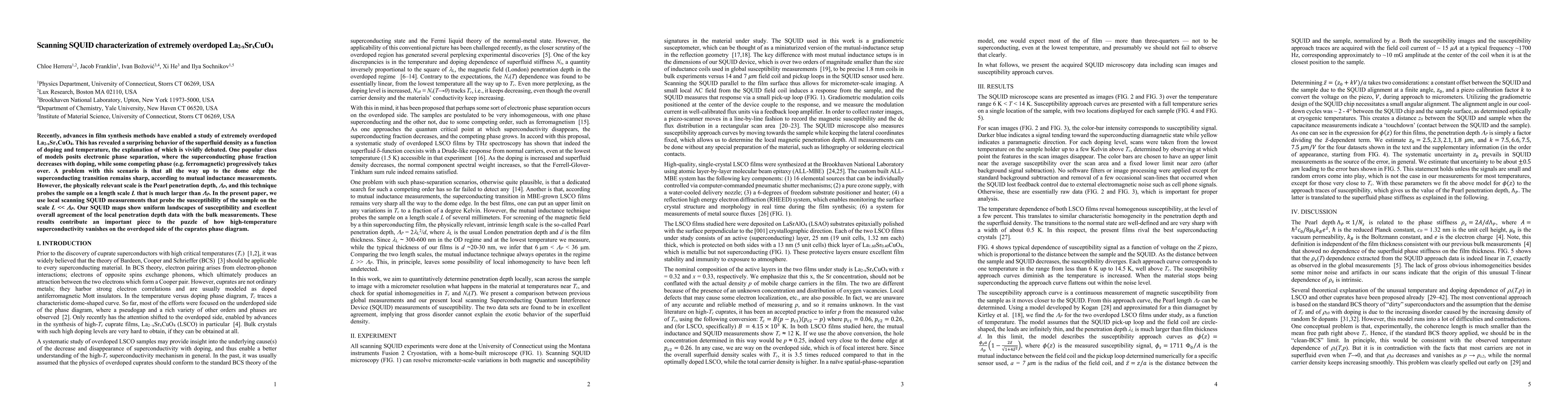 This paper uses scanning SQUID measurements to investigate the superfluid density of extremely overdoped $La_{2-x}Sr_{x}CuO_{4}$, revealing uniform susceptibility landscapes and consistent local penetration depth data with bulk measurements, challenging models of electronic phase separation. These findings provide insight into the disappearance of high-temperature superconductivity in overdoped cuprates.