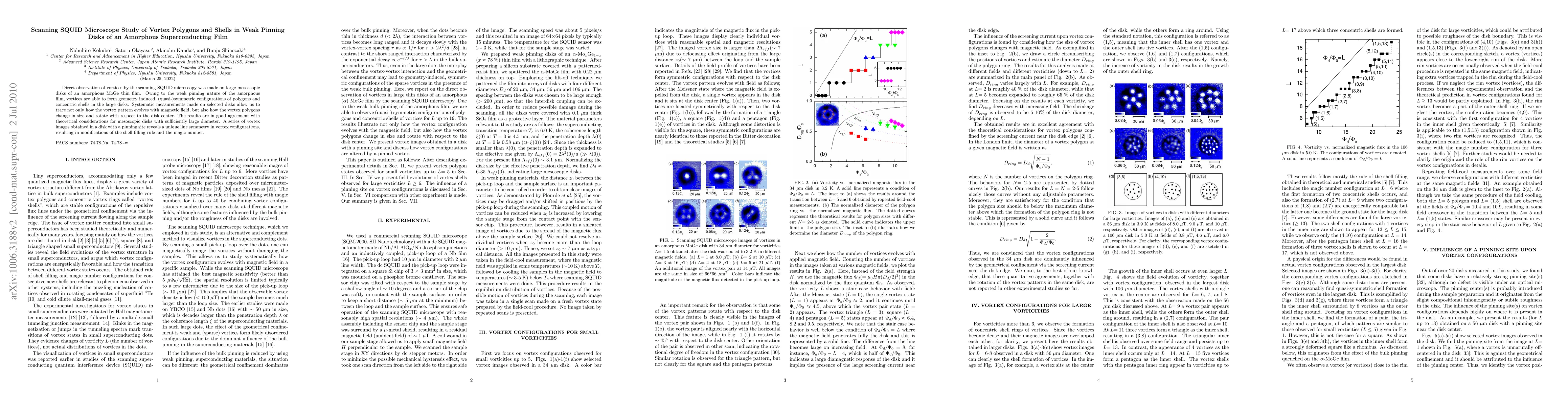 This study uses scanning SQUID microscopy to directly observe vortex configurations in large mesoscopic disks of amorphous MoGe thin film, revealing polygon and shell patterns due to weak pinning. The research systematically traces vortex pattern evolution with magnetic field and identifies unique line symmetry in vortex configurations, modifying shell filling rules and magic numbers.