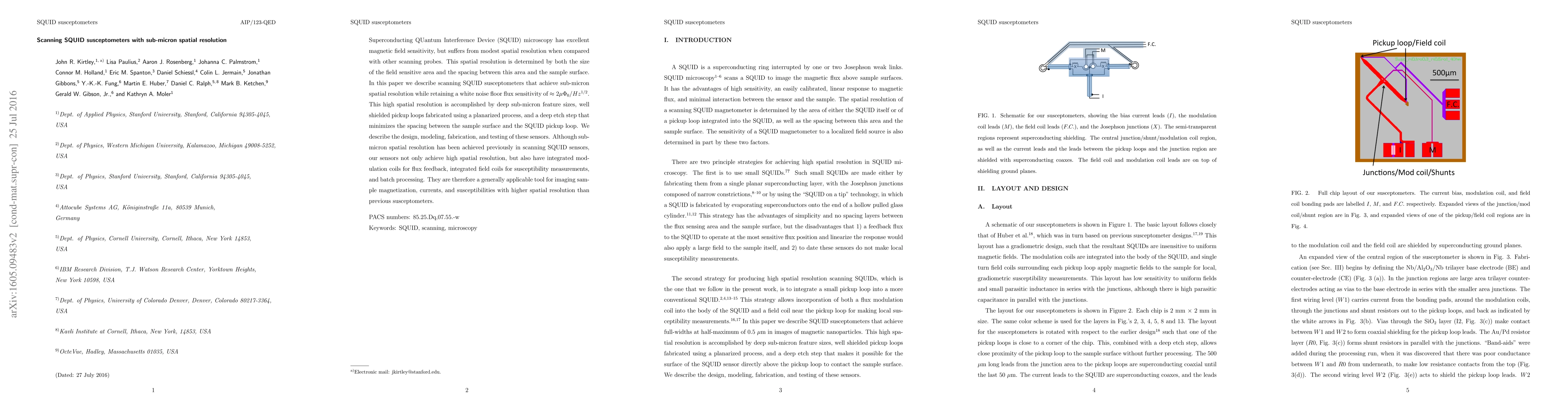 This paper presents scanning SQUID susceptometers achieving sub-micron spatial resolution through advanced fabrication techniques, including deep etch steps and planarized processes, while maintaining high magnetic field sensitivity. These sensors integrate modulation coils and field coils, making them a versatile tool for high-resolution imaging of sample magnetization and susceptibility.