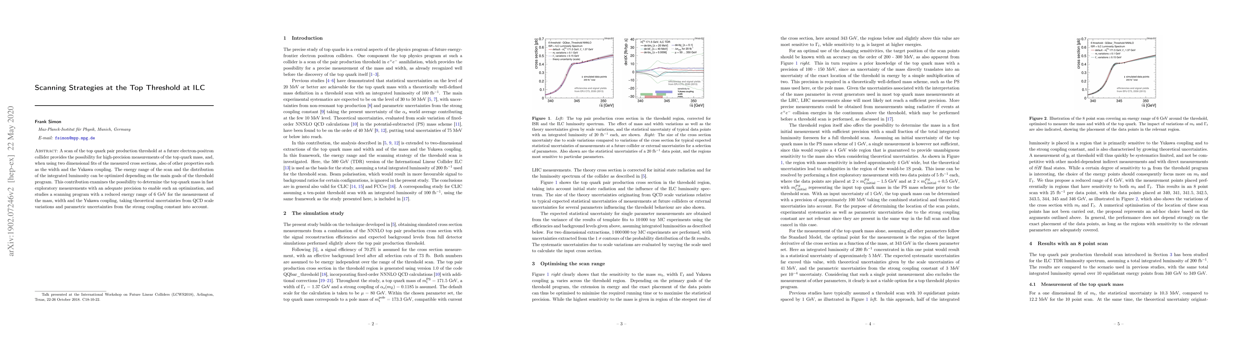 A scan of the top quark pair production threshold at a future electron-positron collider provides the possibility for high-precision measurements of the top quark mass, and, when using two dimensional fits of the measured cross sections, also of other properties such as the width and the Yukawa coupling. The energy range of the scan and the distribution of the integrated luminosity can be optimized depending on the main goals of the threshold program. This contribution examines the possibility to determine the top quark mass in fast exploratory measurements with an adequate precision to enable such an optimization, and studies a scanning program with a reduced energy range of 6 GeV for the measurement of the mass, width and the Yukawa coupling, taking theoretical uncertainties from QCD scale variations and parametric uncertainties from the strong coupling constant into account.
