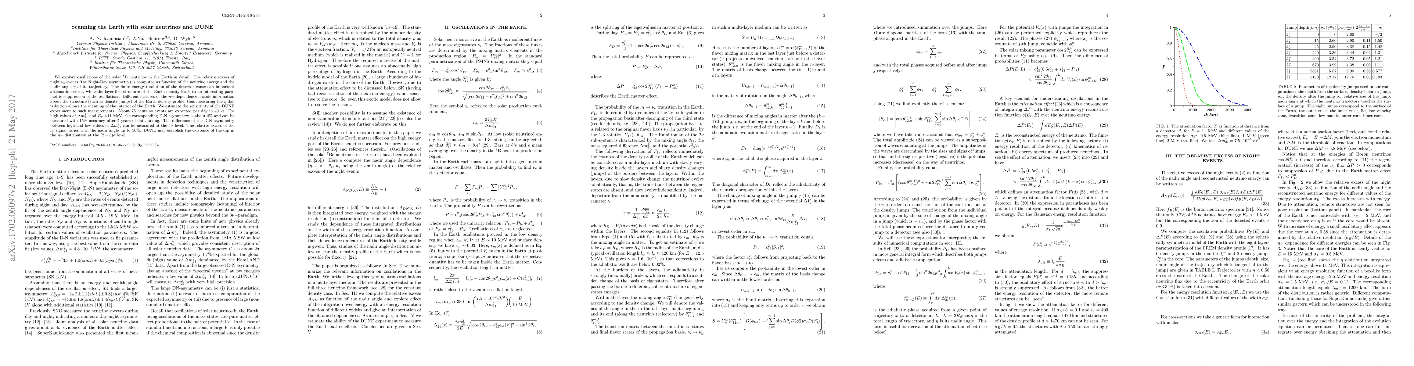 We explore oscillations of the solar $^8$B neutrinos in the Earth in detail. The relative excess of night $\nu_e$ events (the Night-Day asymmetry) is computed as function of the neutrino energy and the nadir angle $\eta$ of its trajectory. The finite energy resolution of the detector causes an important attenuation effect, while the layer-like structure of the Earth density leads to an interesting parametric suppression of the oscillations. Different features of the $\eta-$ dependence encode information about the structure (such as density jumps) of the Earth density profile; thus measuring the $\eta$ distribution allows the scanning of the interior of the Earth. We estimate the sensitivity of the DUNE experiment to such measurements. About 75 neutrino events are expected per day in 40 kt. For high values of $\Delta m^2_{21}$ and $E_\nu > $11 MeV, the corresponding D-N asymmetry is about 4\% and can be measured with $15\%$ accuracy after 5 years of data taking. The difference of the D-N asymmetry between high and low values of $\Delta m^2_{21}$ can be measured at the $4\sigma$ level. The relative excess of the $\nu_e$ signal varies with the nadir angle up to 50\%. DUNE may establish the existence of the dip in the $\eta-$ distribution at the $(2 - 3) \sigma$ level.
