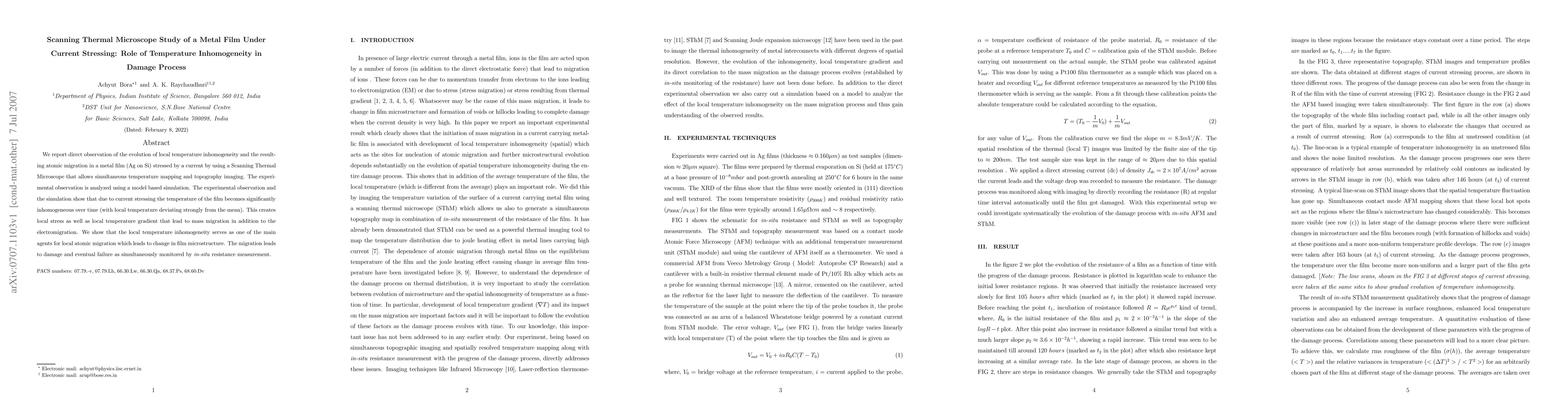 We report direct observation of the evolution of local temperature inhomogeneity and the resulting atomic migration in a metal film (Ag on Si) stressed by a current by using a Scanning Thermal Microscope that allows simultaneous temperature mapping and topography imaging. The experimental observation is analyzed using a model based simulation. The experimental observation and the simulation show that due to current stressing the temperature of the film becomes significantly inhomogeneous over time (with local temperature deviating strongly from the mean). This creates local stress as well as local temperature gradient that lead to mass migration in addition to the electromigration. We show that the local temperature inhomogeneity serves as one of the main agents for local atomic migration which leads to change in film microstructure. The migration leads to damage and eventual failure as simultaneously monitored by in-situ resistance measurement.