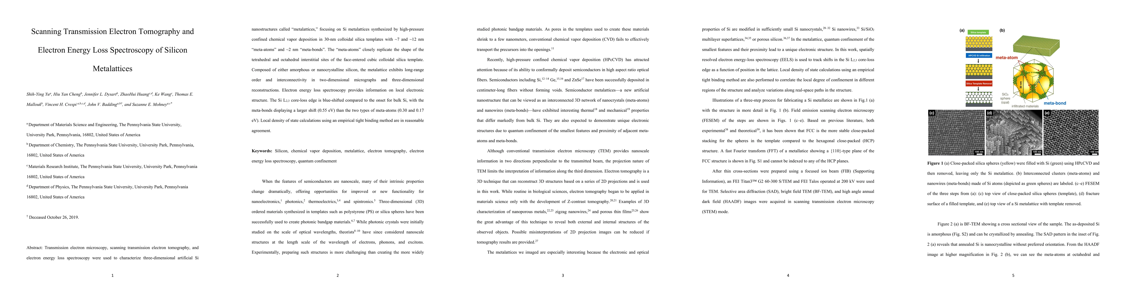 This paper uses scanning transmission electron tomography and electron energy loss spectroscopy to characterize three-dimensional silicon metalattices synthesized via high-pressure chemical vapor deposition. The metalattices exhibit long-range order and show a blue-shift in the Si L2,3 core-loss edge, with meta-bonds showing a larger shift than meta-atoms.