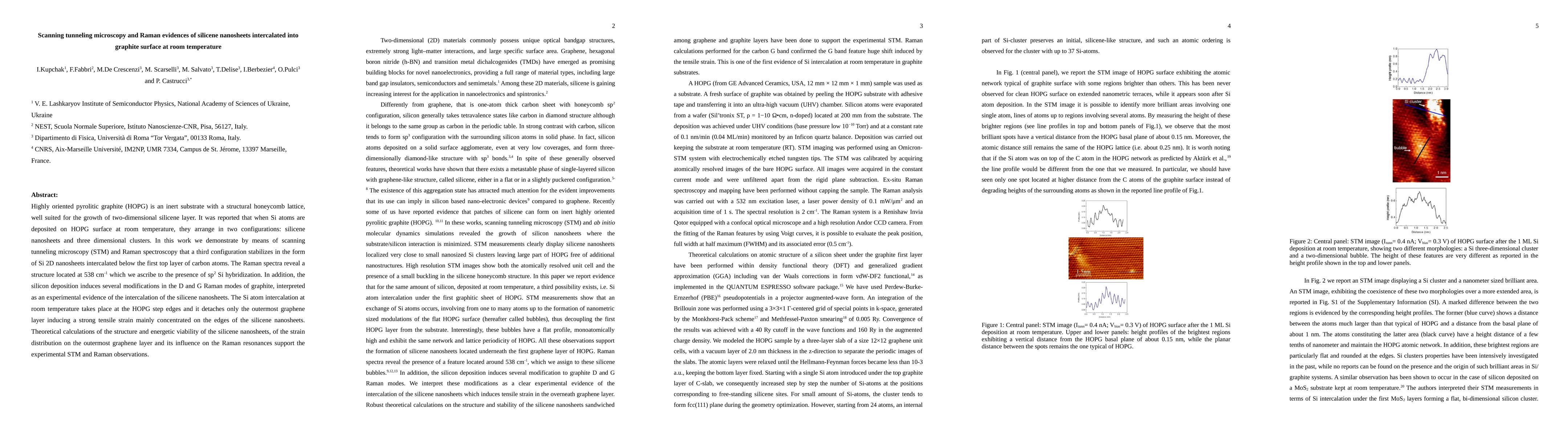 Highly oriented pyrolitic graphite (HOPG) is an inert substrate with a structural honeycomb lattice, well suited for the growth of two-dimensional (2D) silicene layer. It was reported that when Si atoms are deposited on HOPG surface at room temperature, they arrange in two configurations: silicene nanosheets and three dimensional clusters. In this work we demonstrate, by using scanning tunneling microscopy (STM) and Raman spectroscopy, that a third configuration stabilizes in the form of Si 2D nanosheets intercalated below the first top layer of carbon atoms. The Raman spectra reveal a structure located at 538 cm$^{-1}$ which we ascribe to the presence of sp$^2$ Si hybridization. Moreover, the silicon deposition induces several modifications in the graphite D and G Raman modes, which we interpret as an experimental evidence of the intercalation of the silicene nanosheets. The Si atom intercalation at room temperature takes place at the HOPG step edges and it detaches only the outermost graphene layer inducing a strong tensile strain mainly concentrated on the edges of the silicene nanosheets. Theoretical calculations of the structure and energetic viability of the silicene nanosheets, of the strain distribution on the outermost graphene layer and its influence on the Raman resonances support the STM and Raman observations.