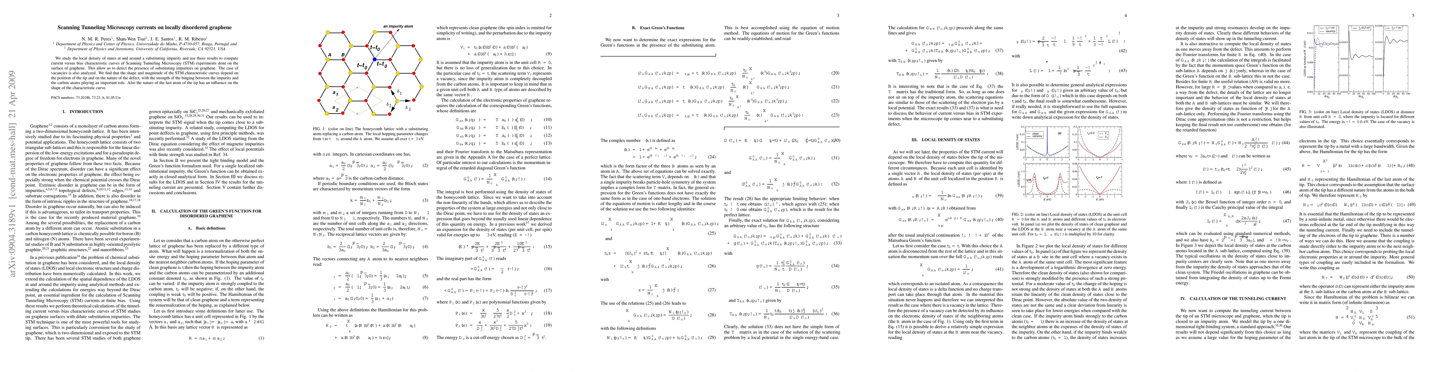 This paper investigates the local density of states near substituting impurities in graphene using Scanning Tunneling Microscopy (STM) to determine the current-bias characteristics. The study reveals that the shape and magnitude of STM characteristic curves are influenced by the defect's position, the binding strength between the impurity and carbon atoms, and the nature of the last atom of the STM tip.