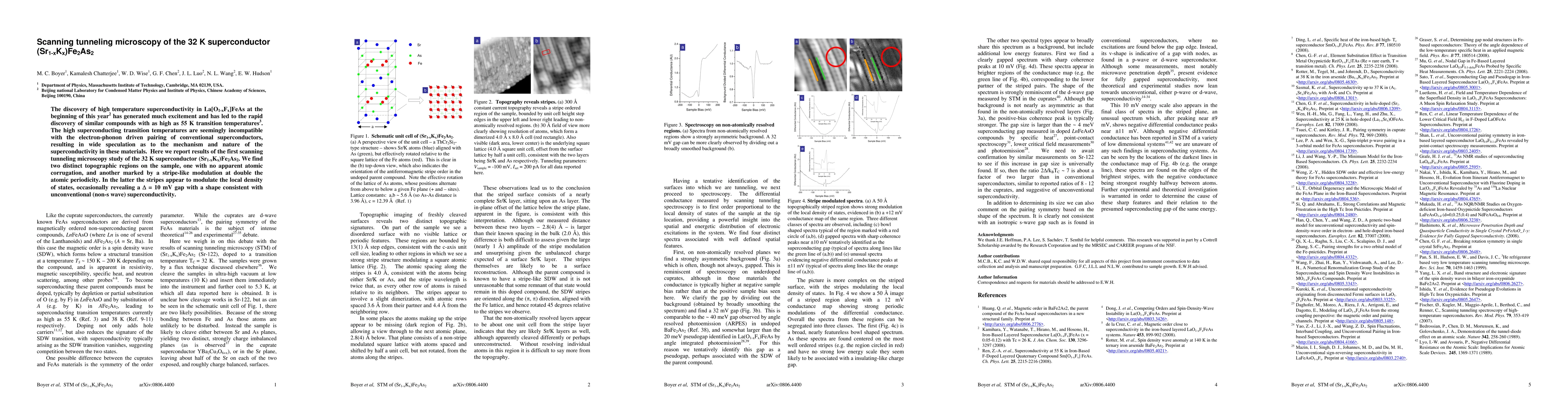 This paper reports the first scanning tunneling microscopy study of the 32 K superconductor (Sr1-xKx)Fe2As2, revealing two distinct topographic regions and suggesting the presence of an unconventional superconductivity with a 10 mV gap in one region. The findings challenge conventional pairing mechanisms for high-temperature superconductivity.