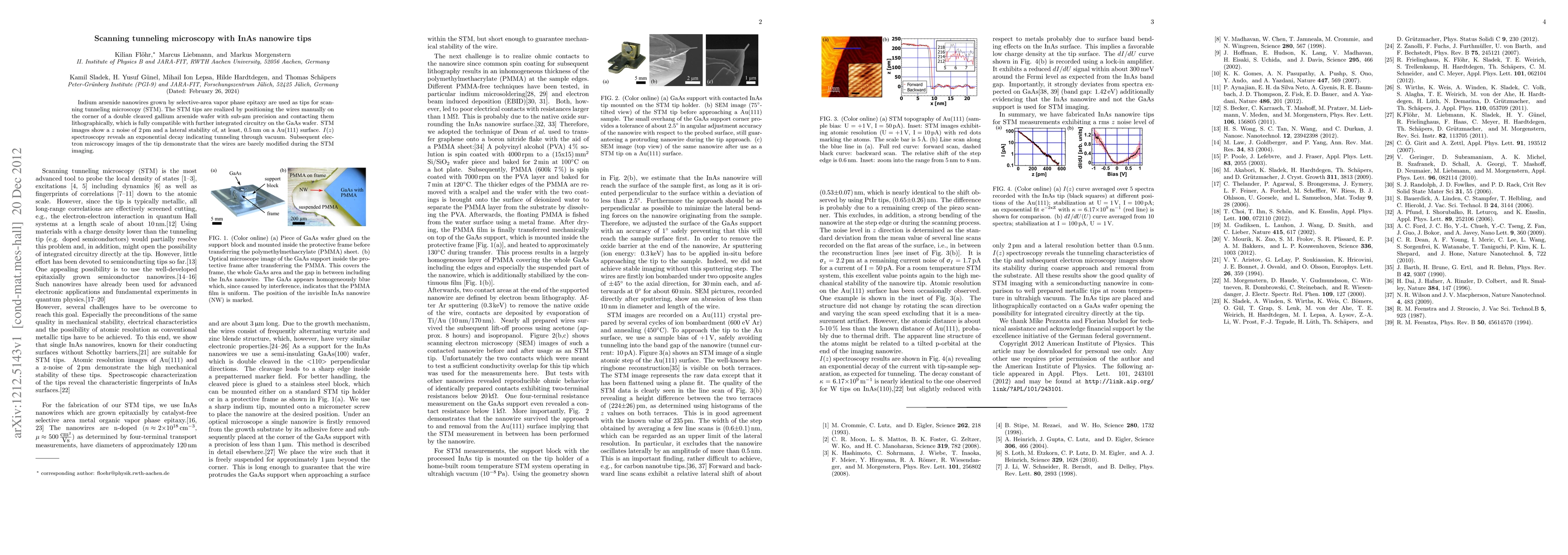 This paper explores the use of InAs nanowires as STM tips, achieving submicrometer precision in positioning and integrating the tips with GaAs wafers. The STM images exhibit minimal z-noise and lateral stability, confirming effective tunneling through vacuum and minimal tip modification during imaging.