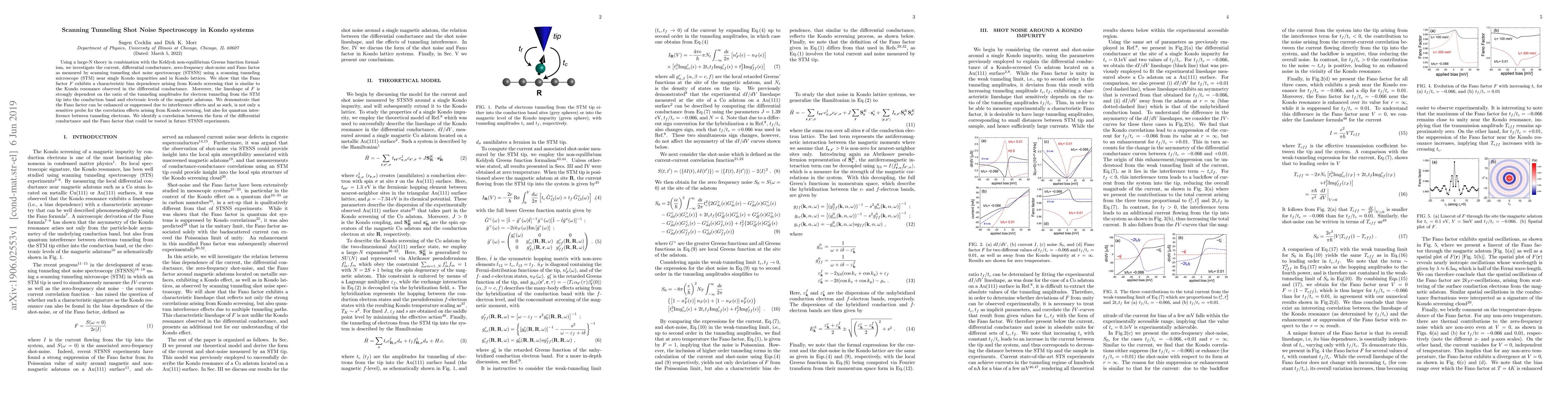 This paper employs large-N theory and Keldysh formalism to study scanning tunneling shot noise spectroscopy in Kondo systems, revealing a bias-dependent Fano factor linked to Kondo screening and demonstrating its sensitivity to quantum interference and tunneling amplitudes.
