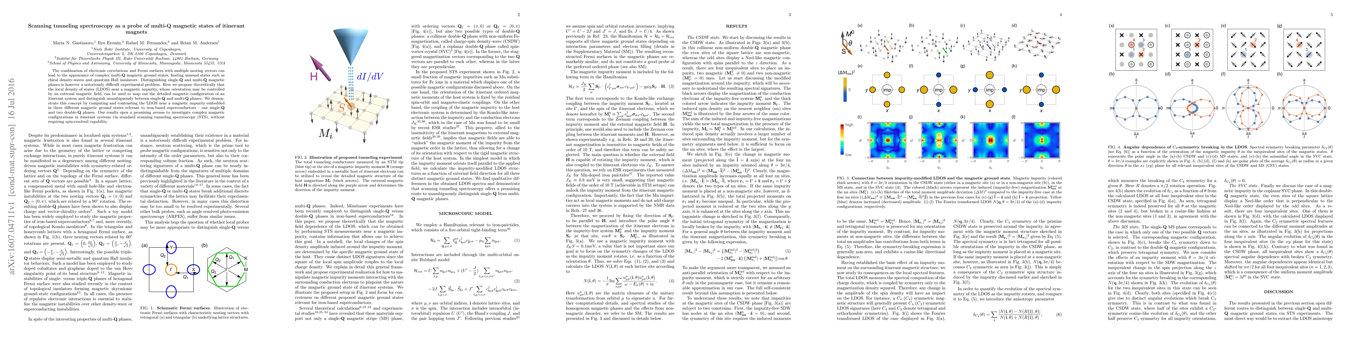 This paper proposes using scanning tunneling spectroscopy to distinguish between single-Q and multi-Q magnetic phases in itinerant magnets by analyzing the local density of states near magnetic impurities. The study demonstrates this concept through computations on iron-based superconductors, showing that standard scanning tunneling spectroscopy can reveal complex magnetic configurations without needing spin-resolved capabilities.