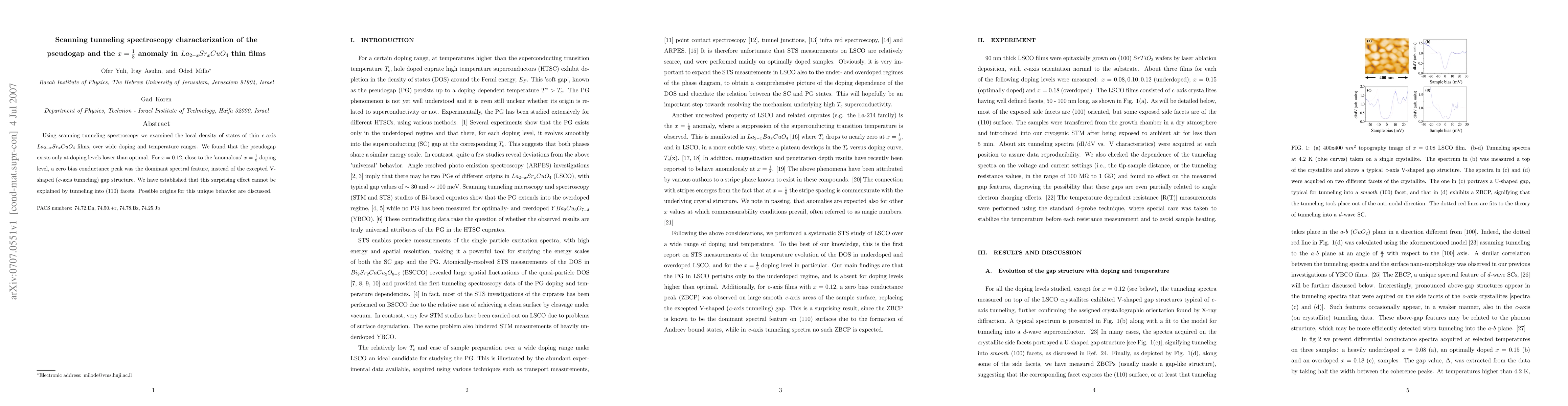 Using scanning tunneling spectroscopy we examined the local density of states of thin c-axis La2-xSrxCuO4 films, over wide doping and temperature ranges. We found that the pseudogap exists only at doping levels lower than optimal. For x = 0.12, close to the 'anomalous' x = 1/8 doping level, a zero bias conductance peak was the dominant spectral feature, instead of the excepted V- shaped (c-axis tunneling) gap structure. We have established that this surprising effect cannot be explained by tunneling into (110) facets. Possible origins for this unique behavior are discussed.
