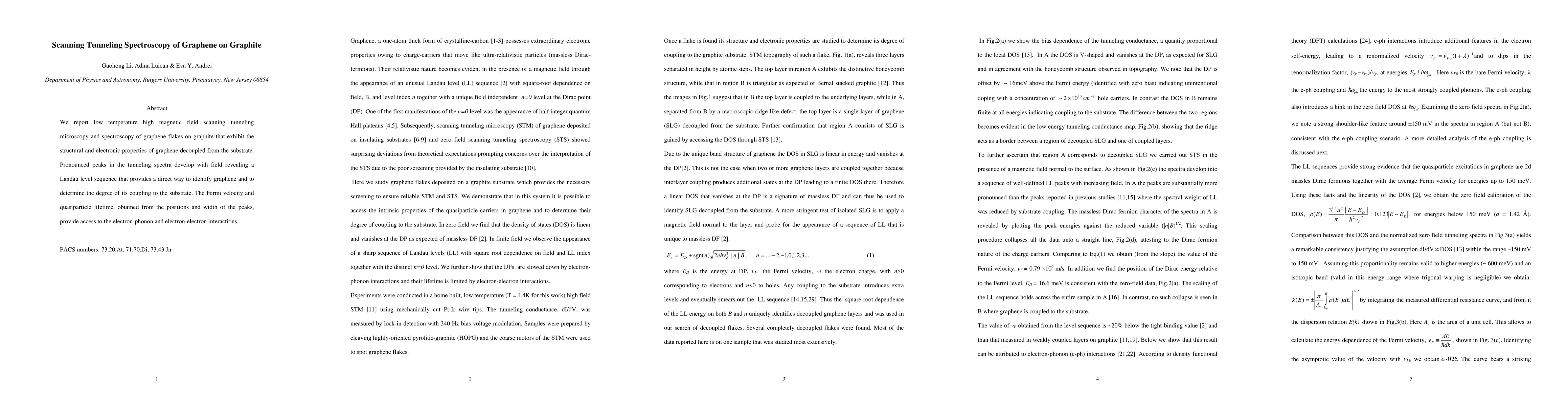 This study uses scanning tunneling microscopy and spectroscopy at low temperatures and high magnetic fields to analyze graphene on graphite, revealing structural and electronic properties of the graphene independent of the substrate. Landau level sequences identified in the tunneling spectra provide insights into graphene's coupling to the substrate and reveal details about electron-phonon and electron-electron interactions through Fermi velocity and quasiparticle lifetime measurements.