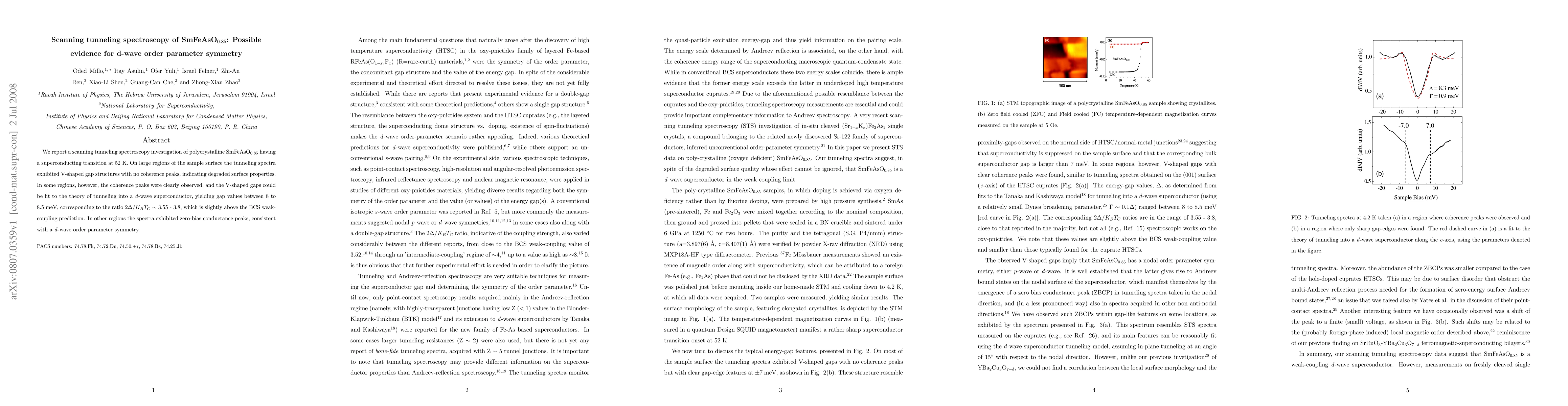 This paper reports scanning tunneling spectroscopy on SmFeAsO0.85, revealing superconducting transitions at 52 K. Some regions show V-shaped gap structures indicative of a d-wave order parameter symmetry, with a gap value slightly above BCS predictions.