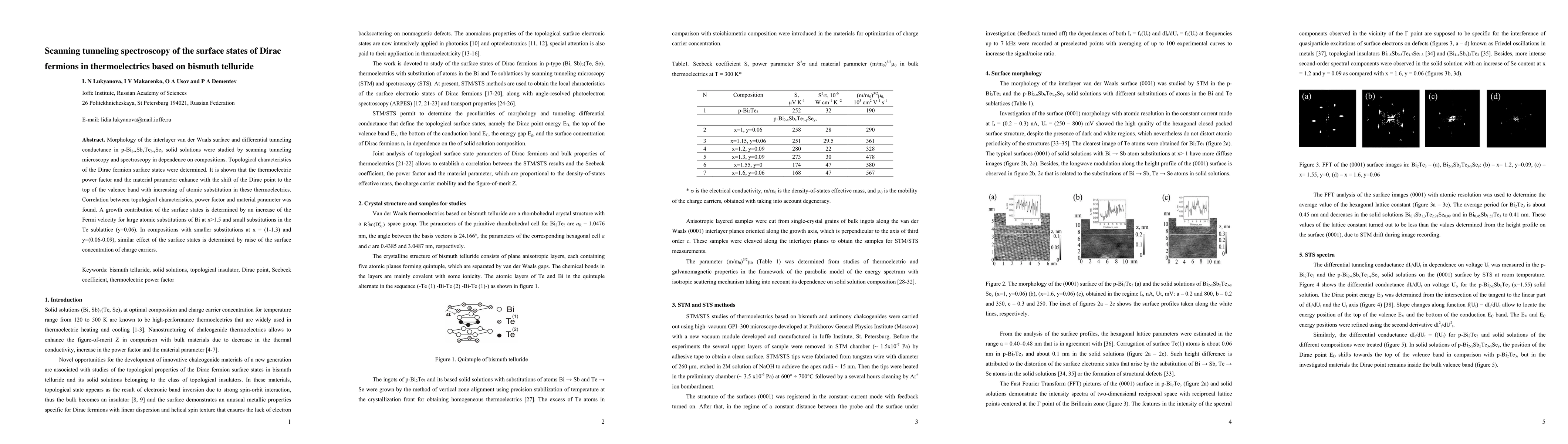 This study uses scanning tunneling microscopy and spectroscopy to analyze the surface states of Dirac fermions in bismuth telluride thermoelectrics. Key findings indicate that the thermoelectric power factor and material parameter enhance with a shift of the Dirac point towards the top of the valence band as atomic substitution increases. The surface states' contribution is attributed to an increase in Fermi velocity for larger Bi substitutions and higher surface carrier concentration for smaller substitutions.