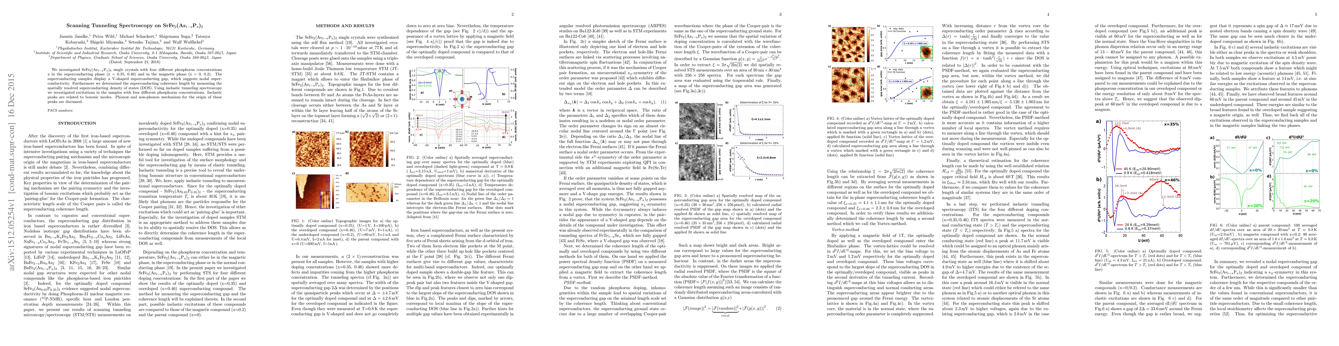 We investigated SrFe$\mathrm{_2}$(As$\mathrm{_{1-x}}$P$\mathrm{_x}$)$\mathrm{_2}$ single crystals with four different phosphorus concentrations x in the superconducting phase (x = 0.35, 0.46) and in the magnetic phase (x = 0, 0.2). The superconducting samples display a V-shaped superconducting gap, which suggests nodal superconductivity. Furthermore we determined the superconducting coherence length by measuring the spatially resolved superconducting density of states (DOS). Using inelastic tunneling spectroscopy we investigated excitations in the samples with four different phosphorus concentrations. Inelastic peaks are related to bosonic modes. Phonon and non-phonon mechanism for the origin of these peaks are discussed.