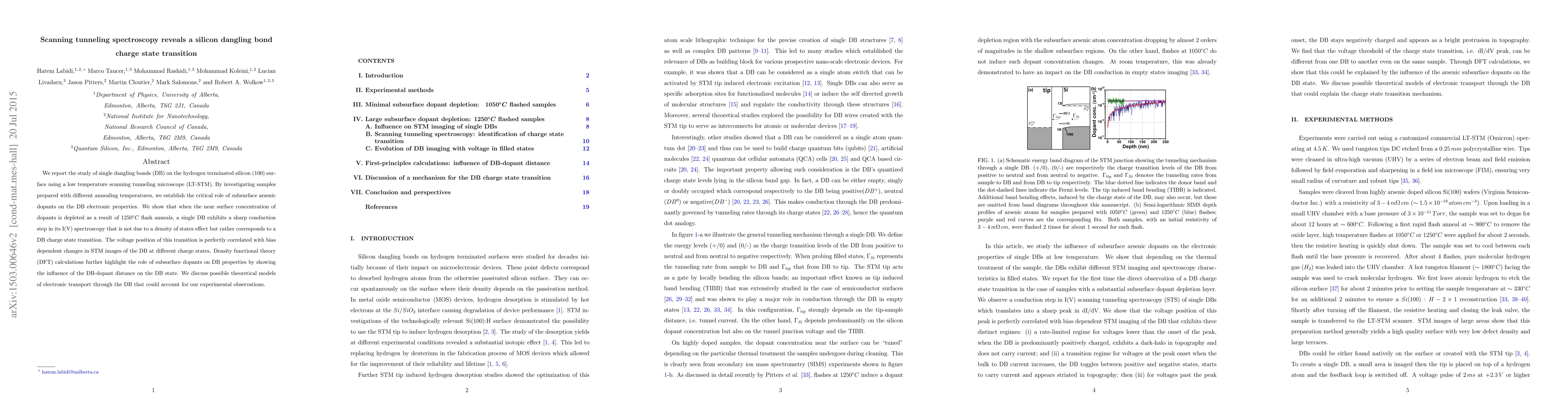 This study uses low-temperature scanning tunneling microscopy to investigate silicon dangling bonds on a hydrogen-terminated silicon (100) surface, revealing a charge state transition in DBs when subsurface arsenic dopants are depleted. The transition is correlated with voltage-dependent changes in STM images and supported by DFT calculations.