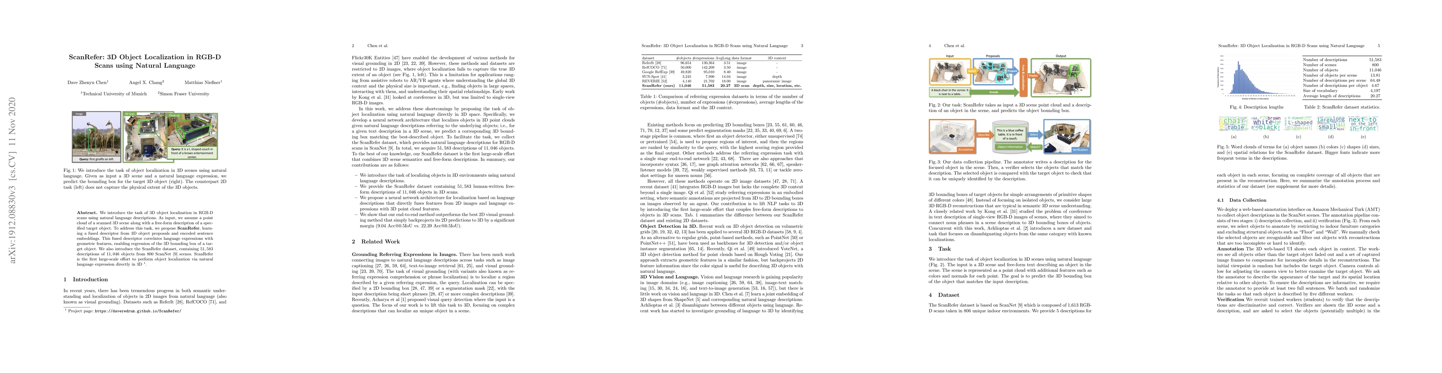 ScanRefer proposes a method for 3D object localization using natural language descriptions and RGB-D scans, learning a fused descriptor from 3D object proposals and sentence embeddings to correlate language with geometric features. The ScanRefer dataset provides 51,583 descriptions for 11,046 objects in 800 ScanNet scenes, marking the first large-scale effort in this domain.