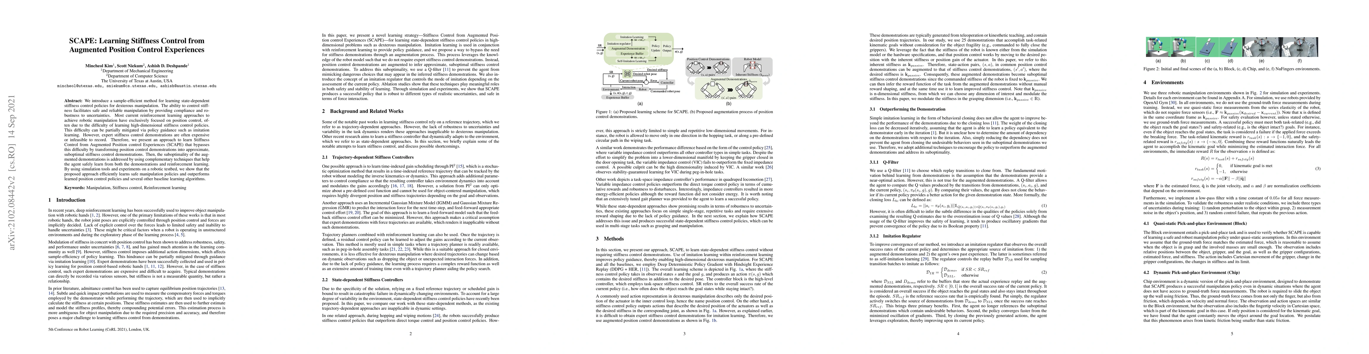 This paper introduces SCAPE, a sample-efficient method for learning state-dependent stiffness control policies for robotic manipulation by transforming position control demonstrations into approximate stiffness control experiences. The approach combines these demonstrations with reinforcement learning to achieve safe and effective manipulation, outperforming traditional position control and other baseline algorithms.