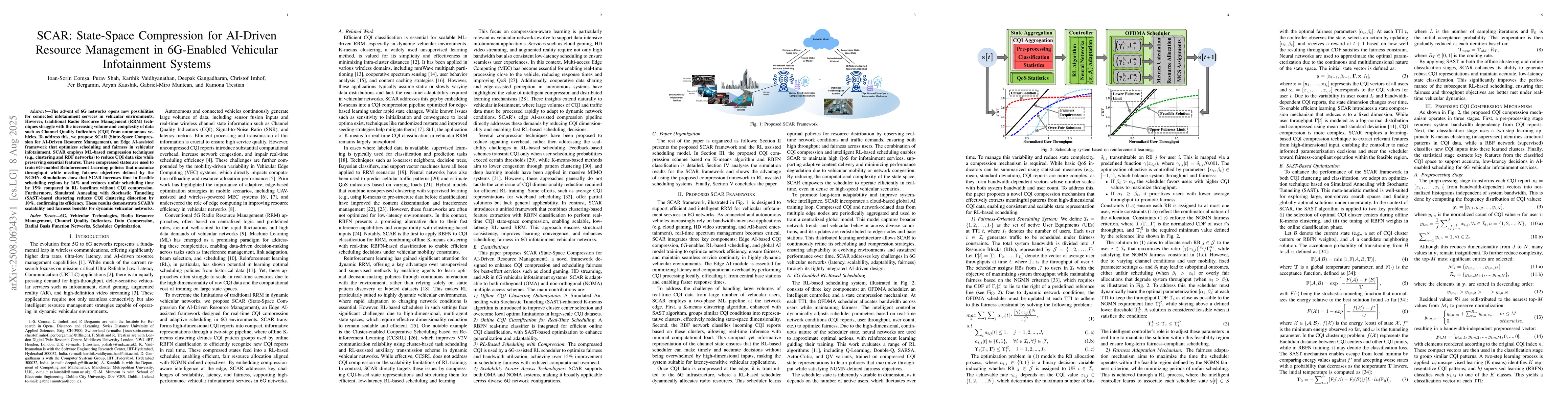 The research proposes SCAR, an Edge AI-assisted framework for optimizing scheduling and fairness in 6G-enabled vehicular infotainment systems using ML-based compression techniques like clustering and RBF networks.