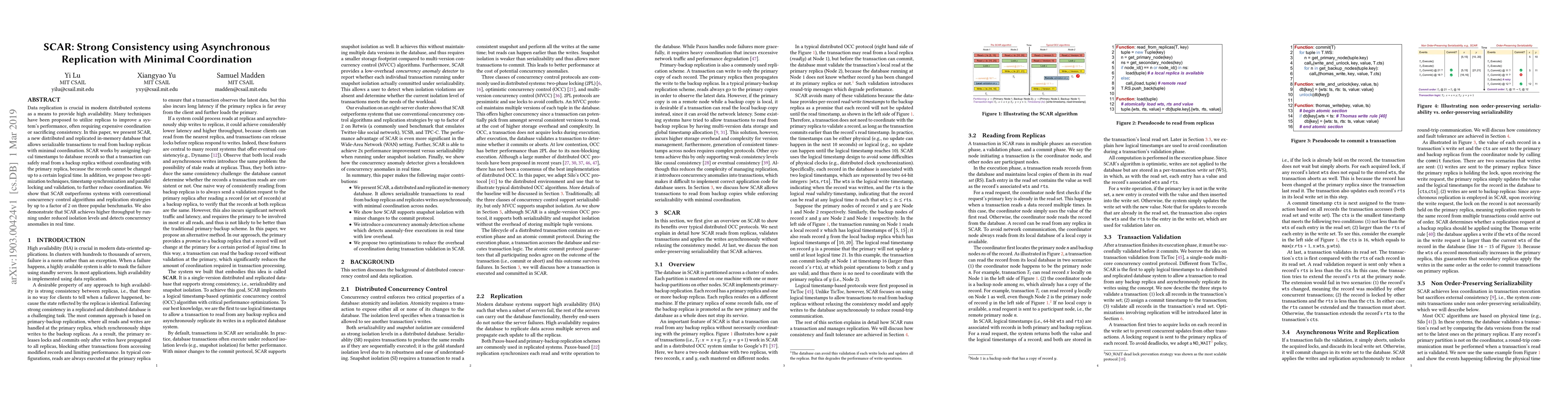 Data replication is crucial in modern distributed systems as a means to provide high availability. Many techniques have been proposed to utilize replicas to improve a system's performance, often requiring expensive coordination or sacrificing consistency. In this paper, we present SCAR, a new distributed and replicated in-memory database that allows serializable transactions to read from backup replicas with minimal coordination. SCAR works by assigning logical timestamps to database records so that a transaction can safely read from a backup replica without coordinating with the primary replica, because the records cannot be changed up to a certain logical time. In addition, we propose two optimization techniques, timestamp synchronization and parallel locking and validation, to further reduce coordination. We show that SCAR outperforms systems with conventional concurrency control algorithms and replication strategies by up to a factor of 2 on three popular benchmarks. We also demonstrate that SCAR achieves higher throughput by running under reduced isolation levels and detects concurrency anomalies in real time.
