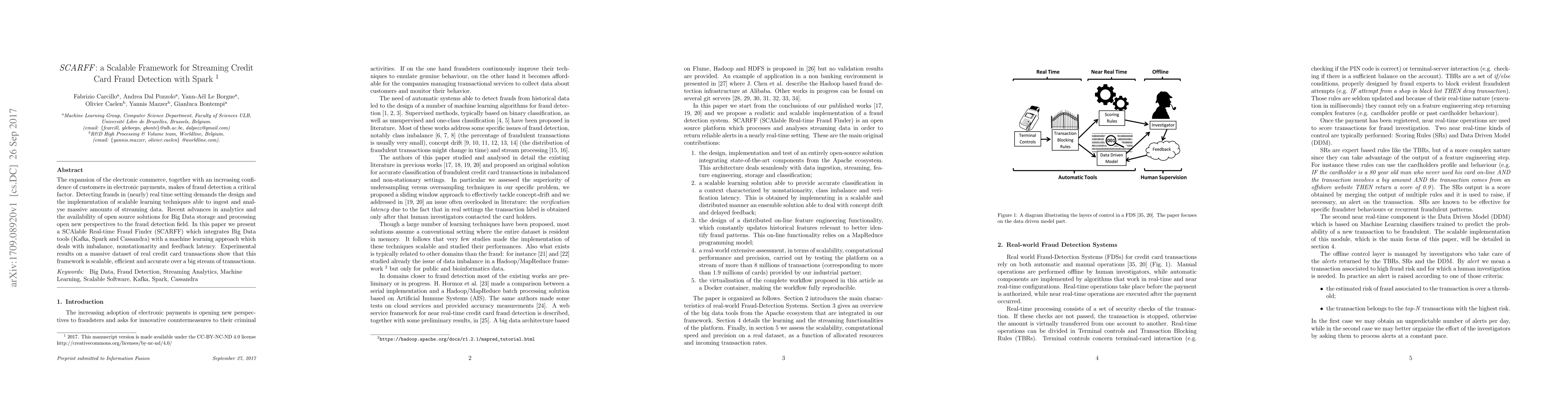The paper introduces SCARFF, a scalable framework for real-time credit card fraud detection using Big Data tools (Kafka, Spark, Cassandra) and machine learning techniques to handle data imbalance and nonstationarity. Experimental results demonstrate the framework's scalability, efficiency, and accuracy in processing large streaming datasets of credit card transactions.