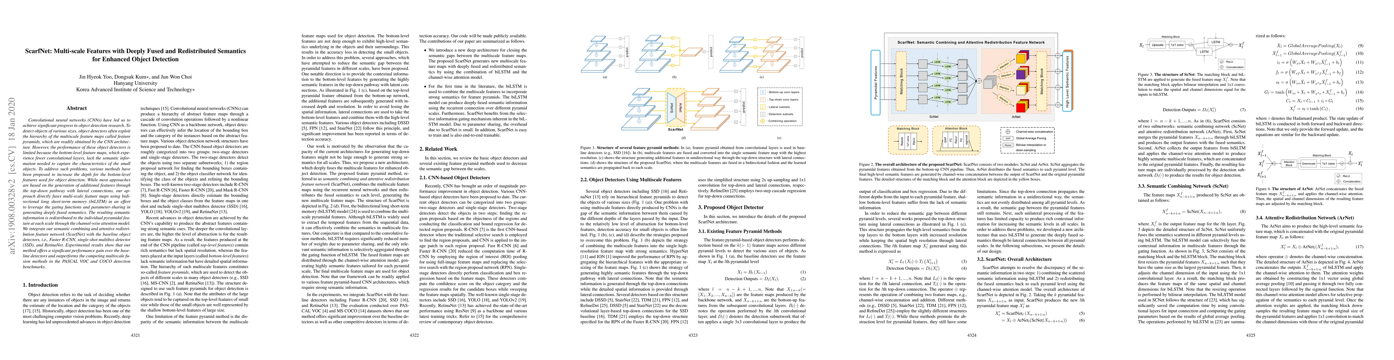 ScarfNet proposes a novel method to enhance object detection by deeply fusing multi-scale feature maps using bidirectional LSTM and redistributing semantic information through channel-wise attention. This approach improves the detection of objects of various sizes by addressing the semantic limitations of bottom-level feature maps.