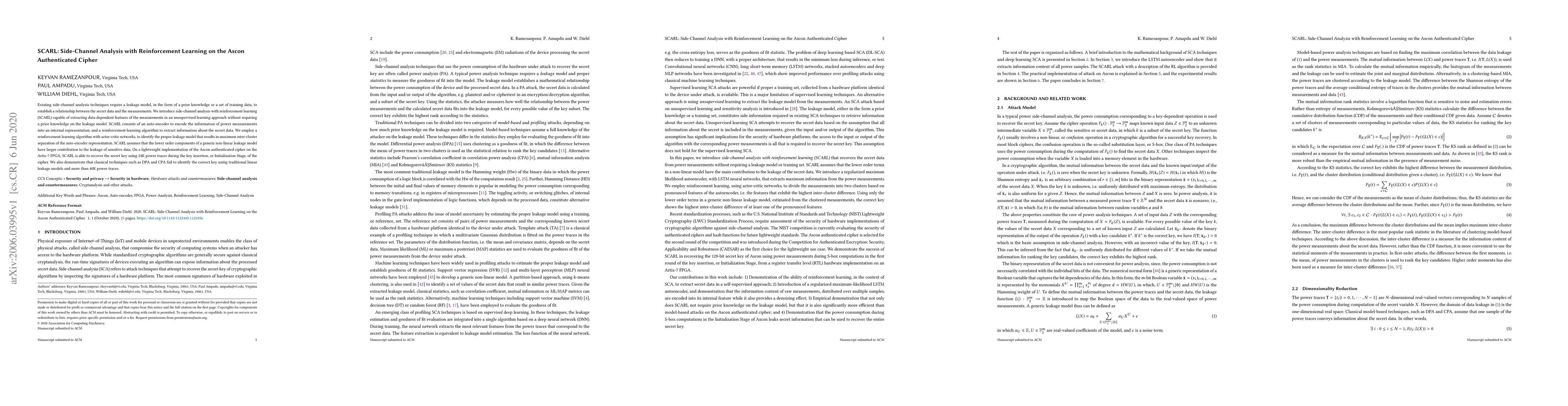 This paper introduces SCARL, a reinforcement learning-based approach for side-channel analysis that does not require a predefined leakage model. SCARL uses an auto-encoder to encode power measurements and a reinforcement learning algorithm to extract secret data information, successfully recovering the secret key in Ascon's key insertion stage. Traditional side-channel analysis techniques like DPA and CPA fail with linear models.