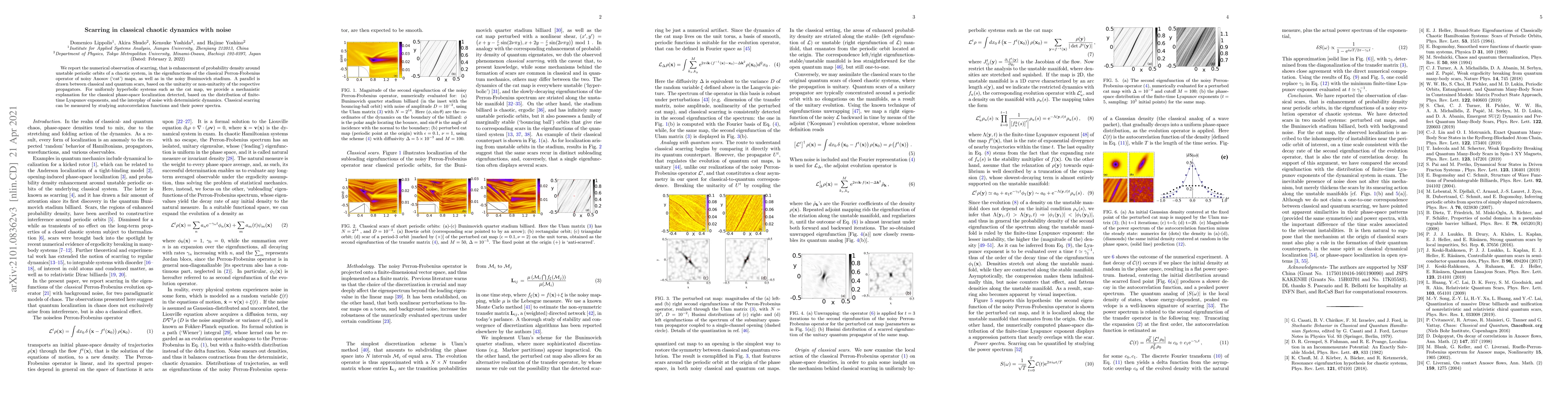 This paper observes classical scarring in chaotic systems with noise, showing enhanced probability density near unstable periodic orbits in the eigenfunctions of the Perron-Frobenius operator for noisy Anosov maps and the Bunimovich stadium. It draws parallels between classical and quantum scars, explaining the phenomenon through the distribution of finite-time Lyapunov exponents and the interplay of noise with deterministic dynamics.